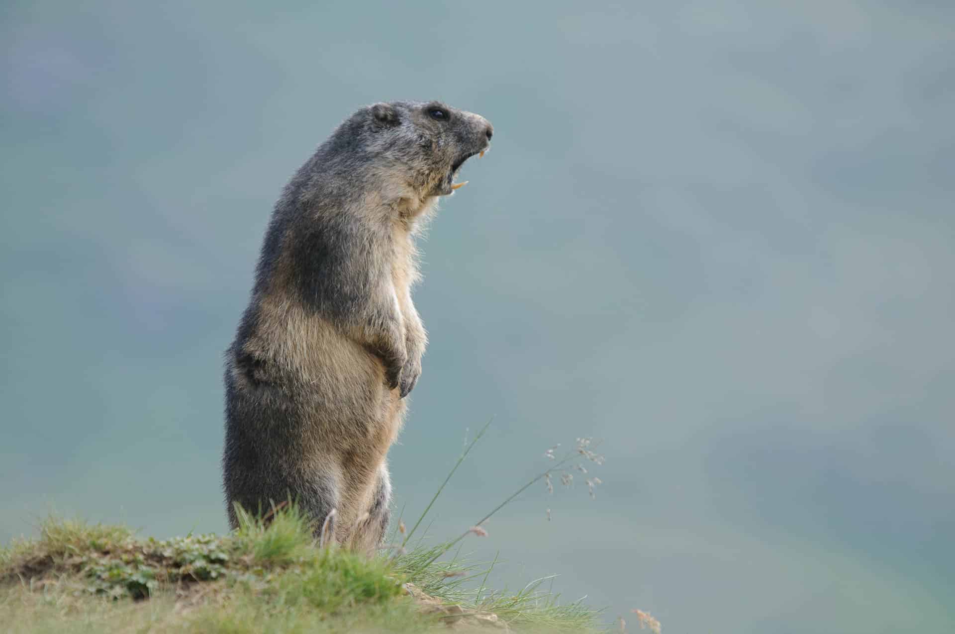 Ein aufrecht stehendes Alpenmurmeltier in einer alpinen Wiese.