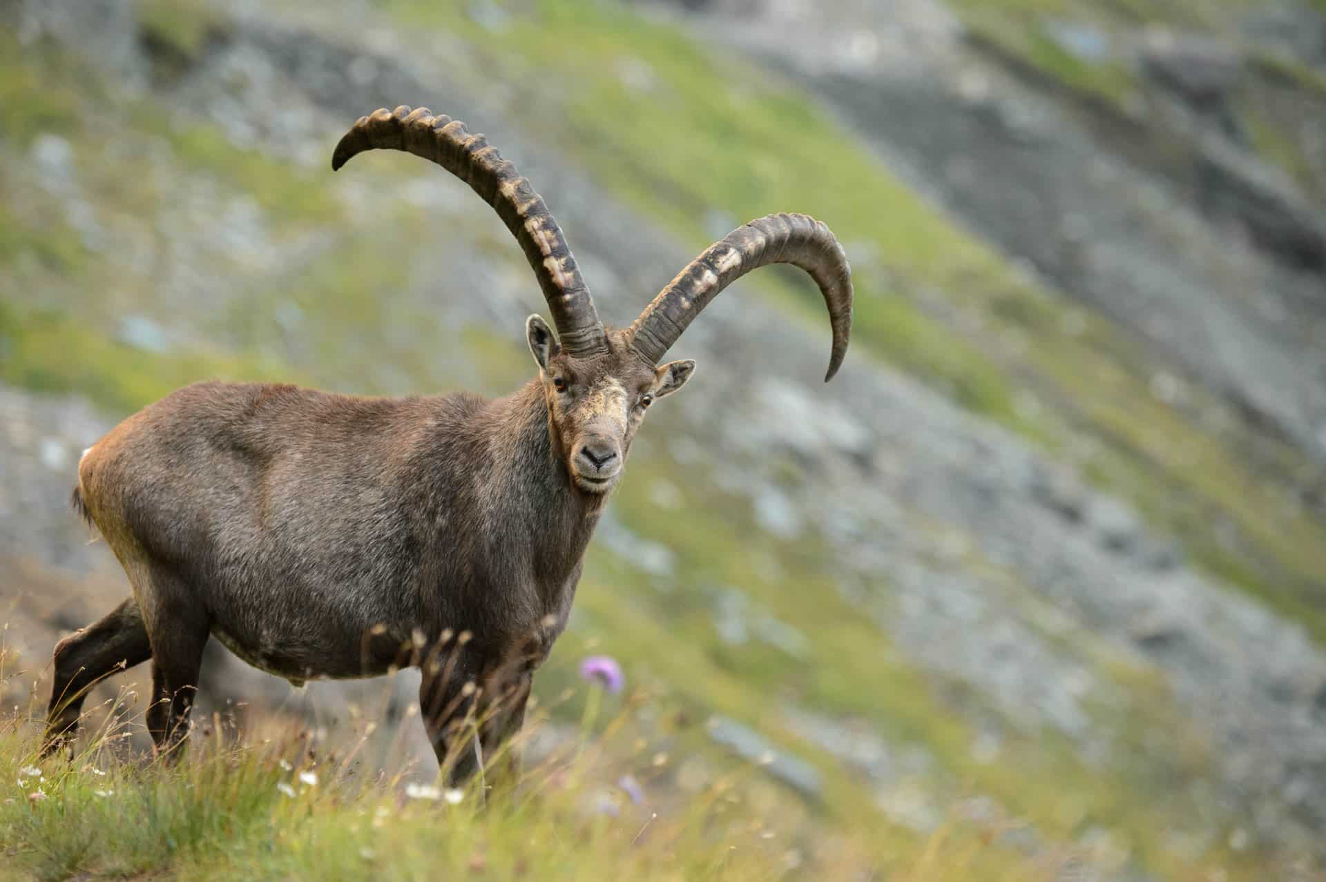 Alpensteinbock mit großen Hörnern in alpiner Landschaft stehend.