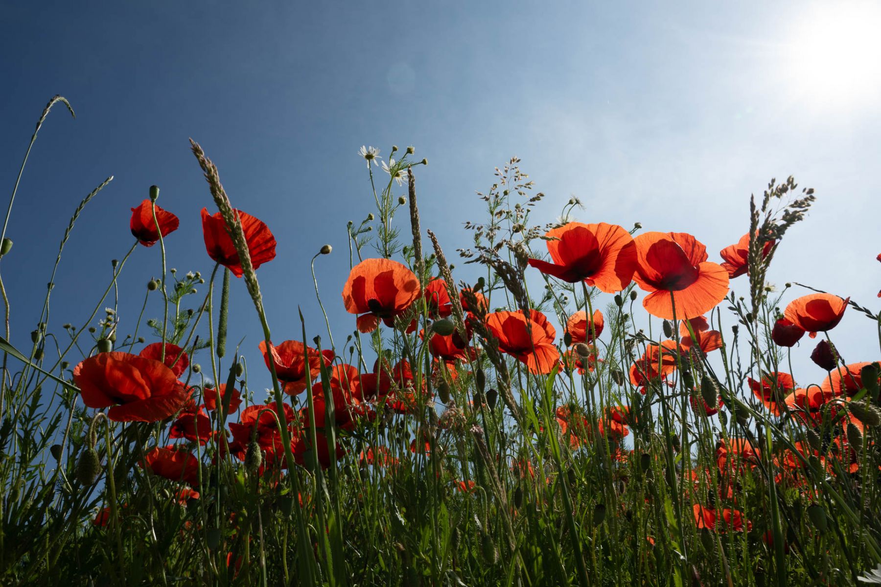 Ein Feld mit leuchtend roten Mohnblumen unter blauem Himmel.
