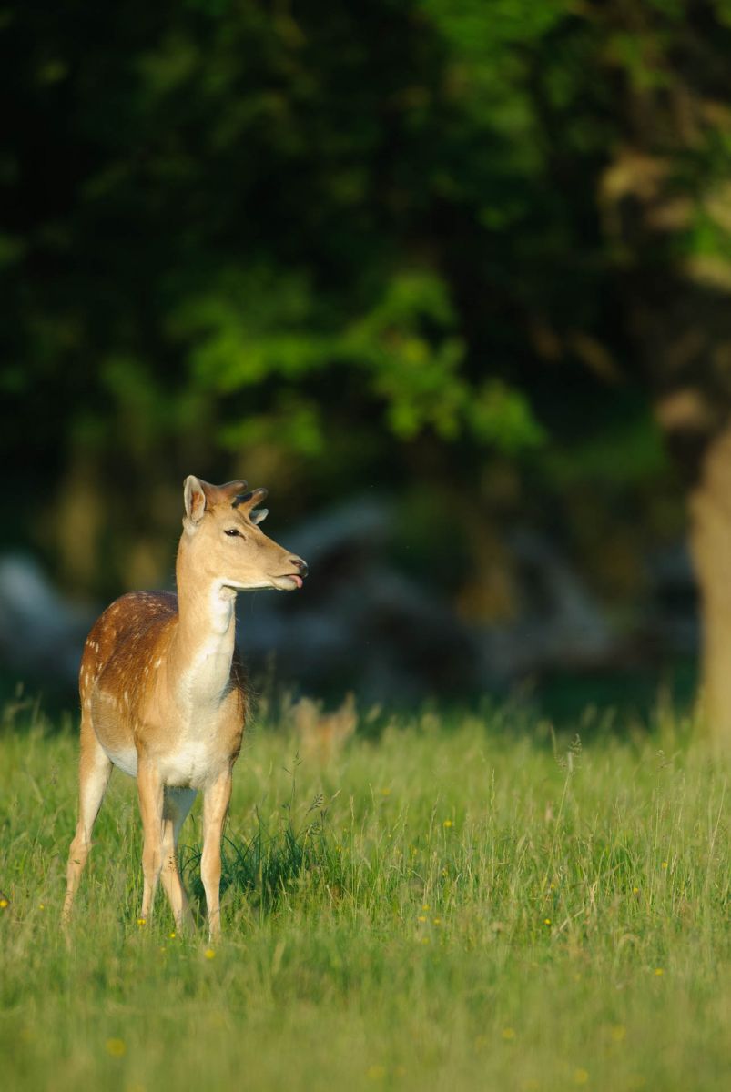 Ein Damhirsch steht in einer grรผnen Lichtung bei Tageslicht.