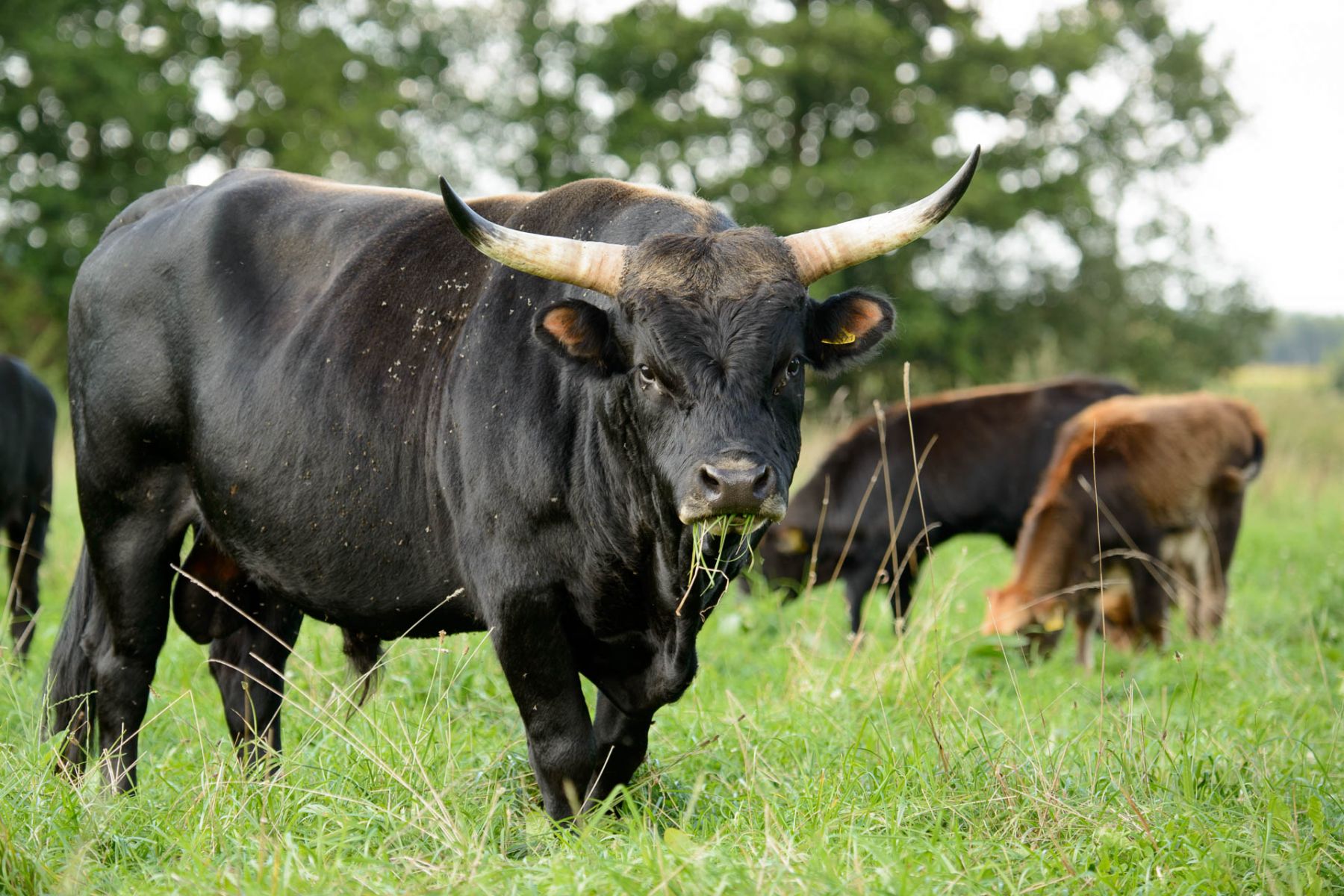 Heckrind mit groรŸen Hรถrnern auf grรผner Wiese in Deutschland.