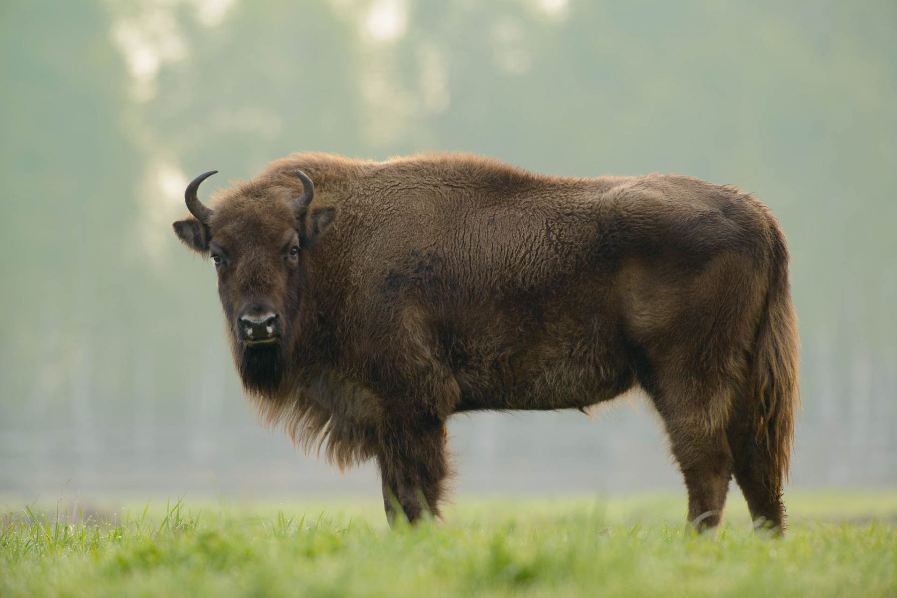 Ein Wisent steht auf einer grรผnen Wiese mit verschwommener Waldkulisse.