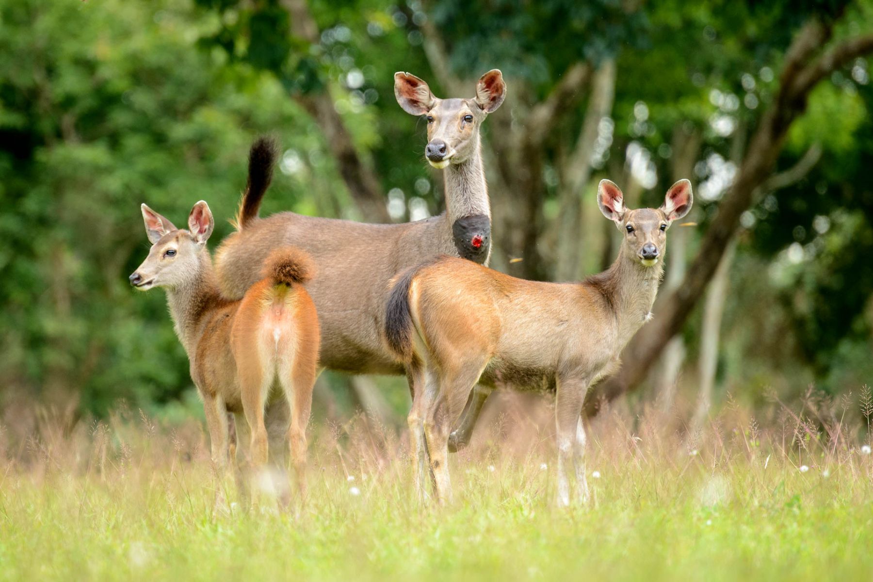 Eine kleine Gruppe von Sambarhirschen im Grasland eines tropischen Waldes.
