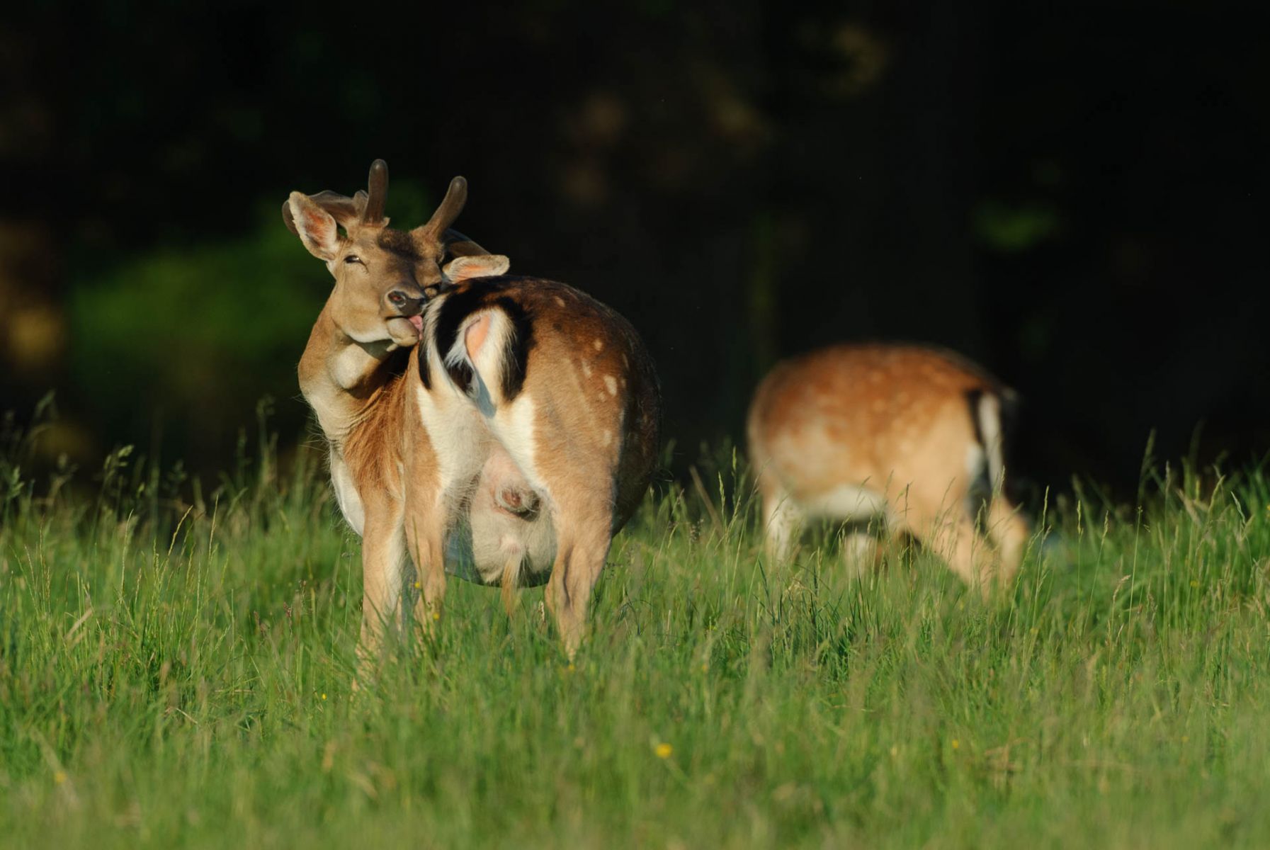 Zwei Damhirsche im hohen Gras, einer zeigt seinen Rücken mit geflecktem Fellmuster.