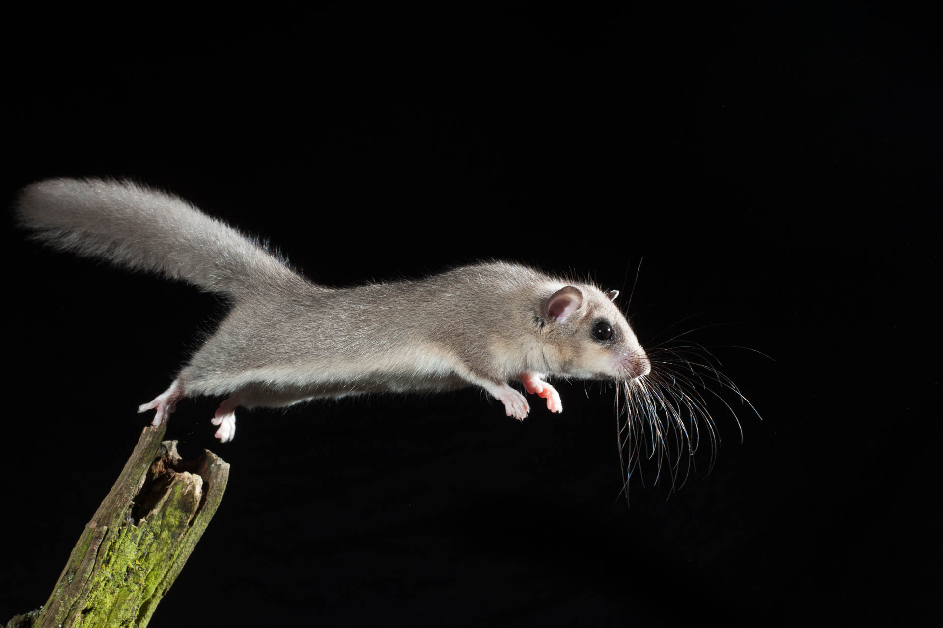 Siebenschläfer in der Luft während eines Sprungs von einem Ast
