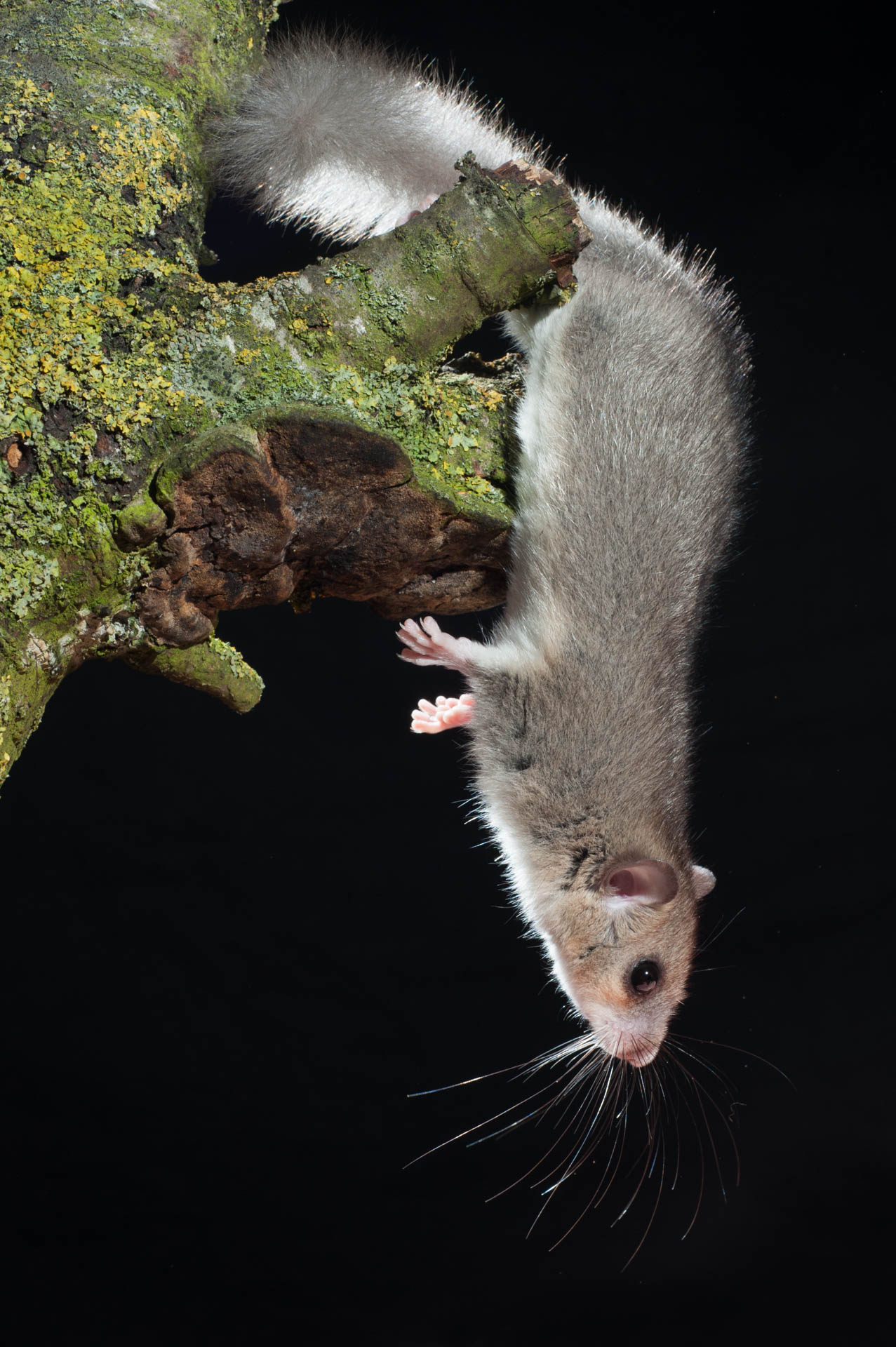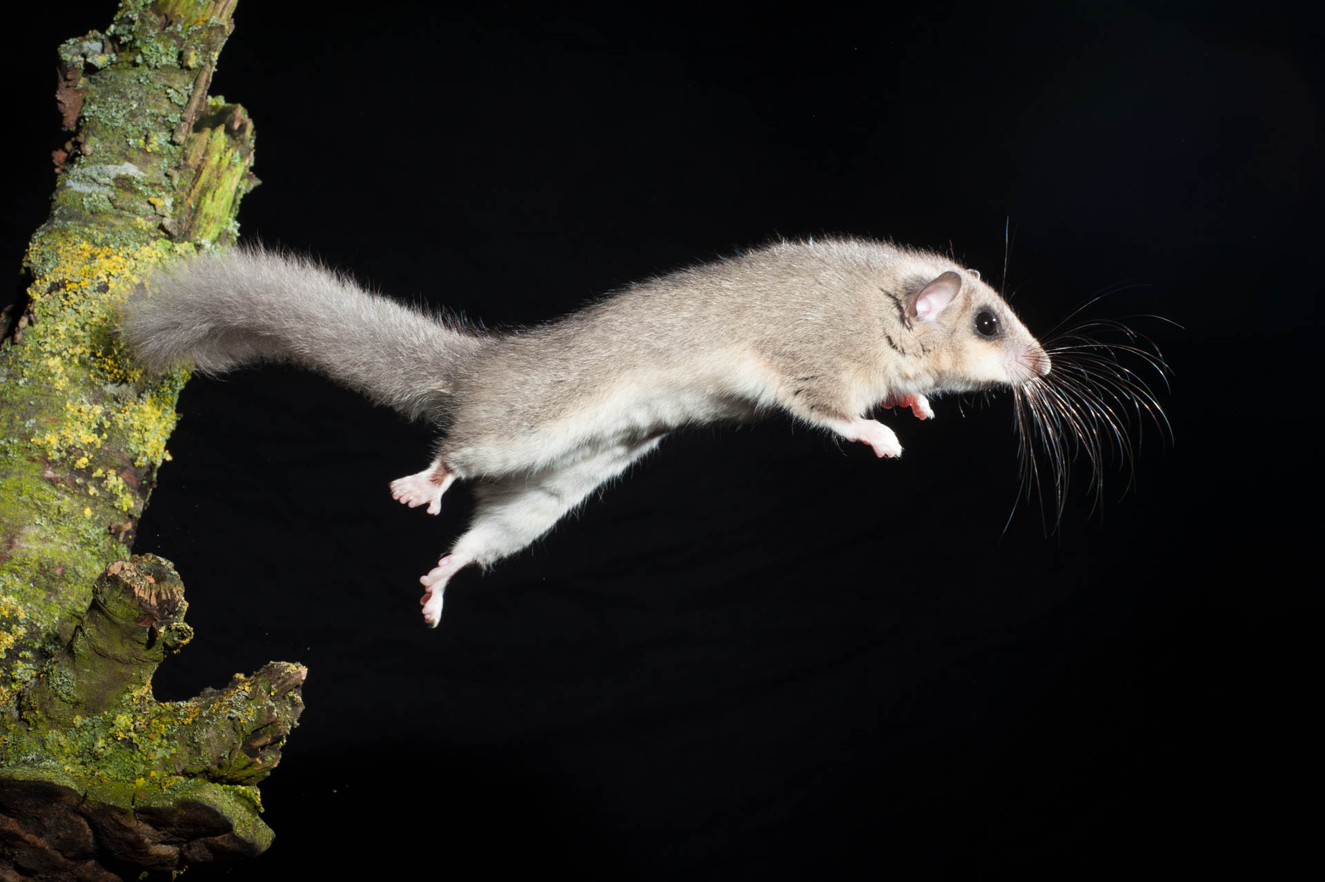 Ein Siebenschläfer springt von einem Ast, im Flug eingefangen, vor schwarzem Hintergrund.