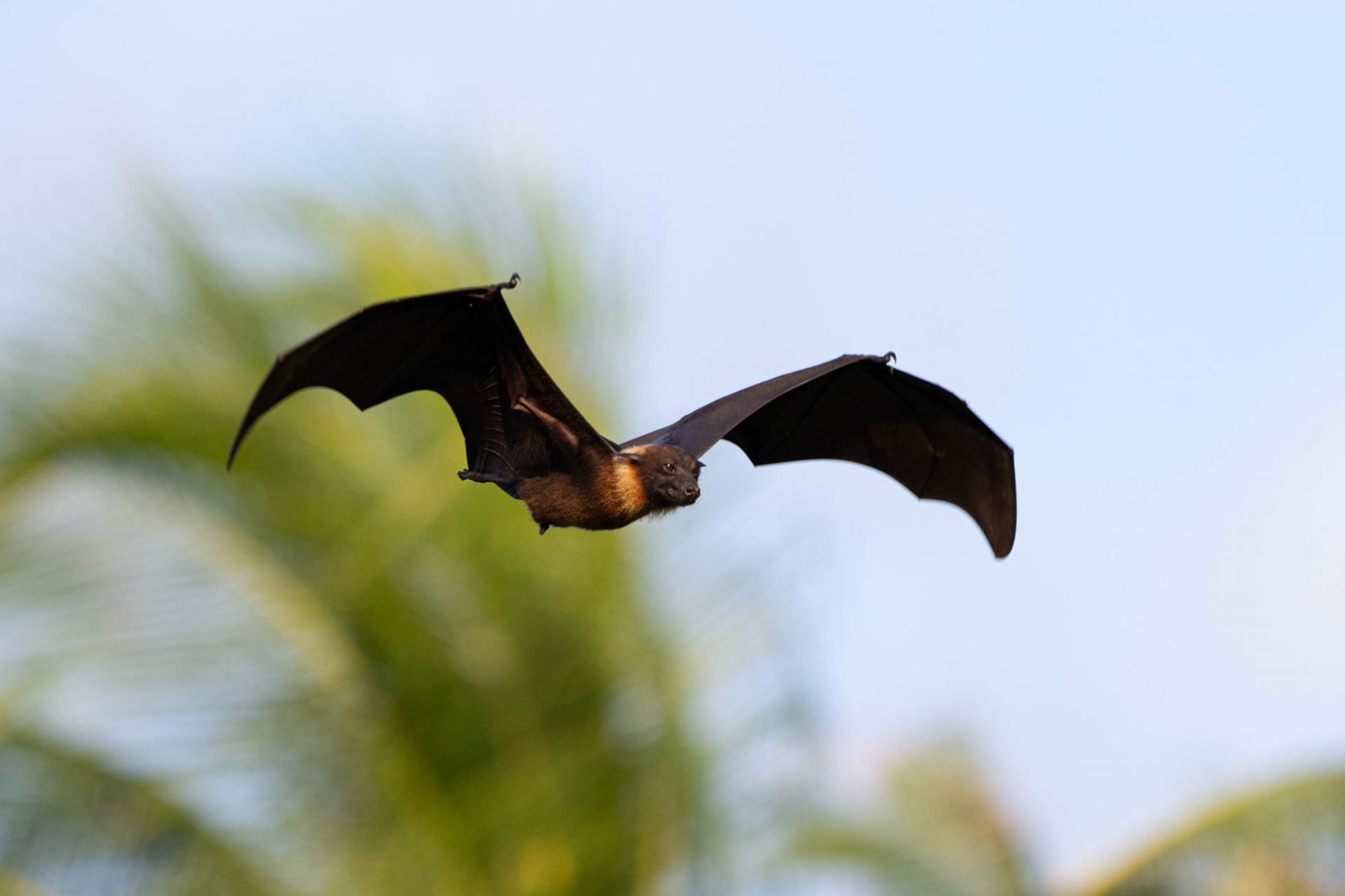Ein Flughund mit geöffneten Flügeln fliegt vor unscharfem Palmhintergrund.