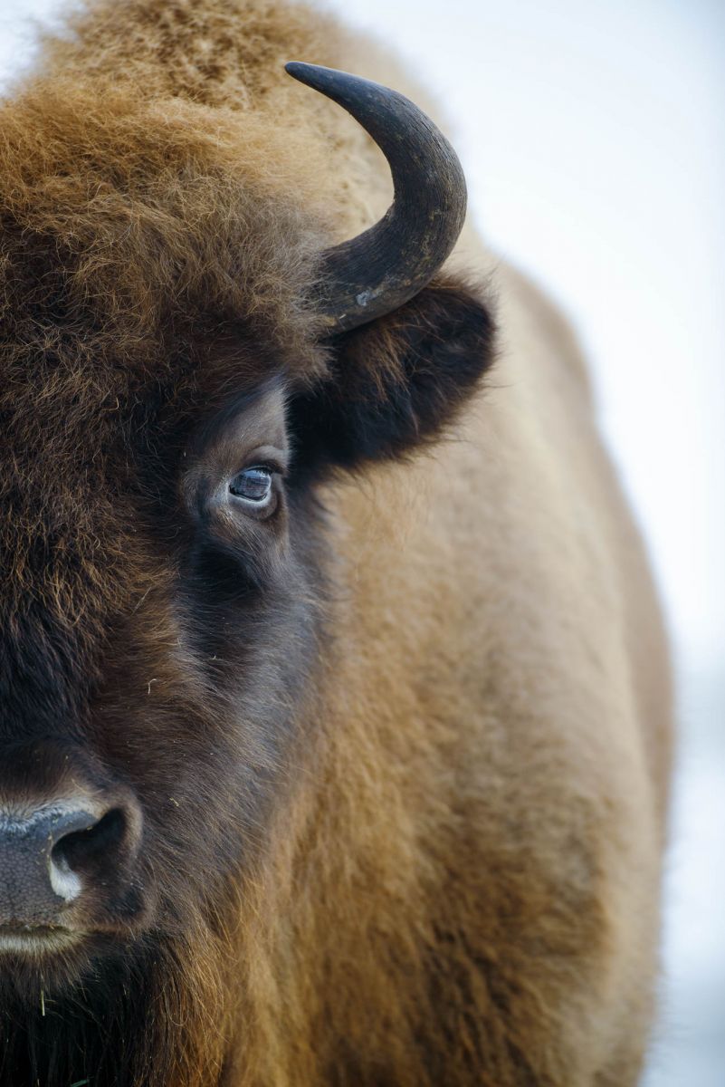 Nahaufnahme eines Wisents mit dichtem, braunem Fell und hellem Hintergrund.
