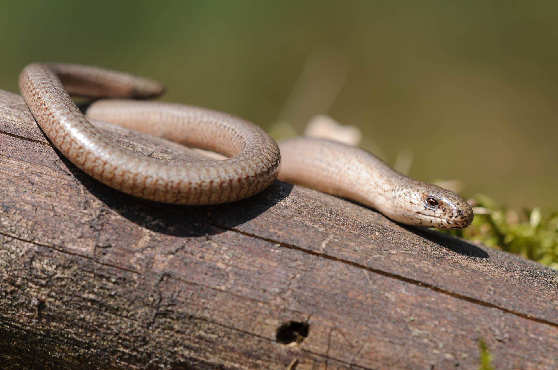 Eine Blindschleiche ruht auf einem Baumstamm in natürlicher Umgebung.