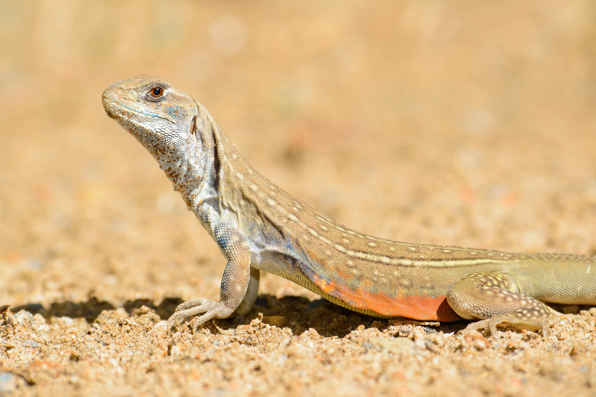 Eine Schmetterlingsagame liegt auf einem sandigen Boden.