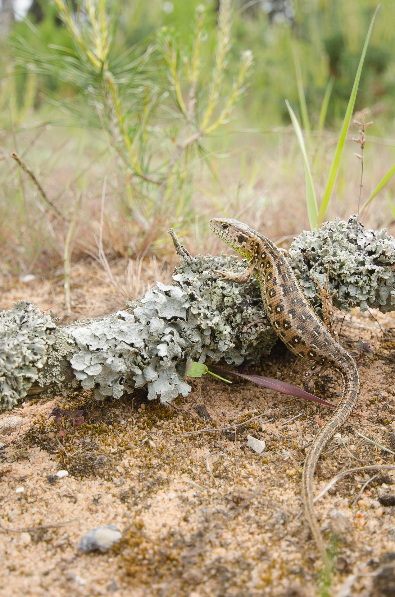 Weibliche Zauneidechse sonnt sich auf einem Flechten bewachsenen Ast im sandigen Gelände.
