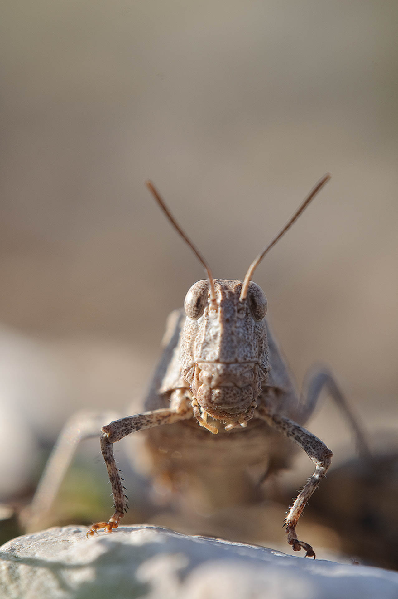 Nahaufnahme einer sandfarbenen Heuschrecke mit charakteristischen blau gefärbten Flügeln.