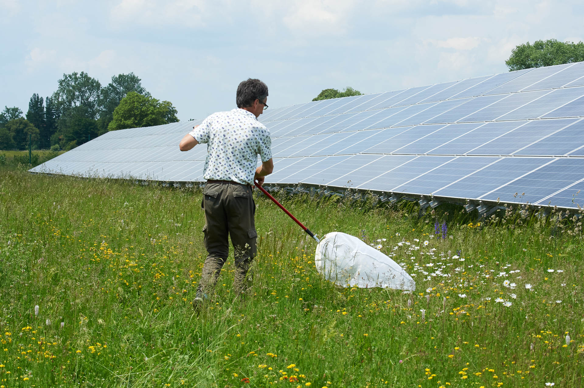 Mensch mit Insektennetz untersucht Wiese neben Solarpanels