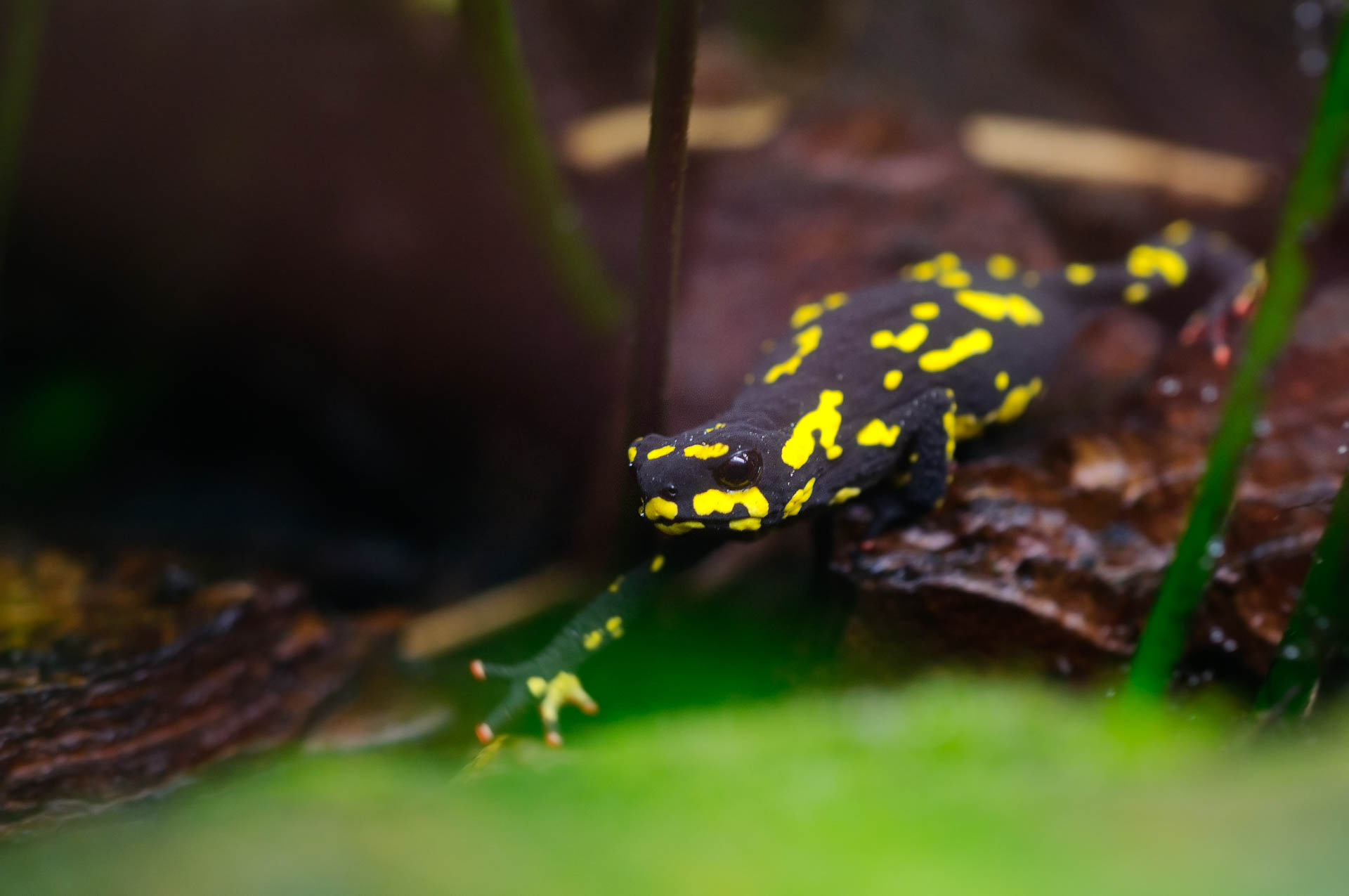Schwarzkrötchen mit gelben Flecken auf schwarzer Haut kriecht über einen moosbedeckten Untergrund.