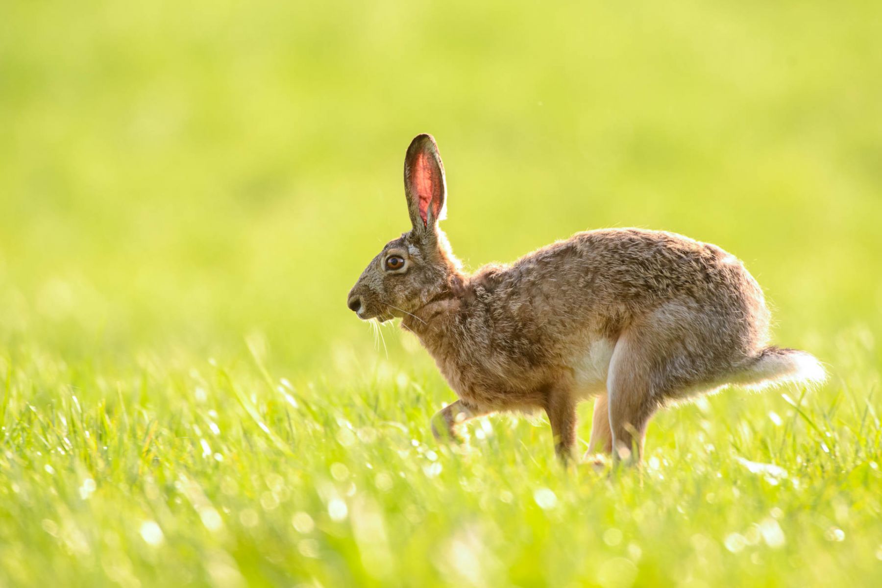 Ein Feldhase sitzt aufmerksam in einer grünen Wiese.