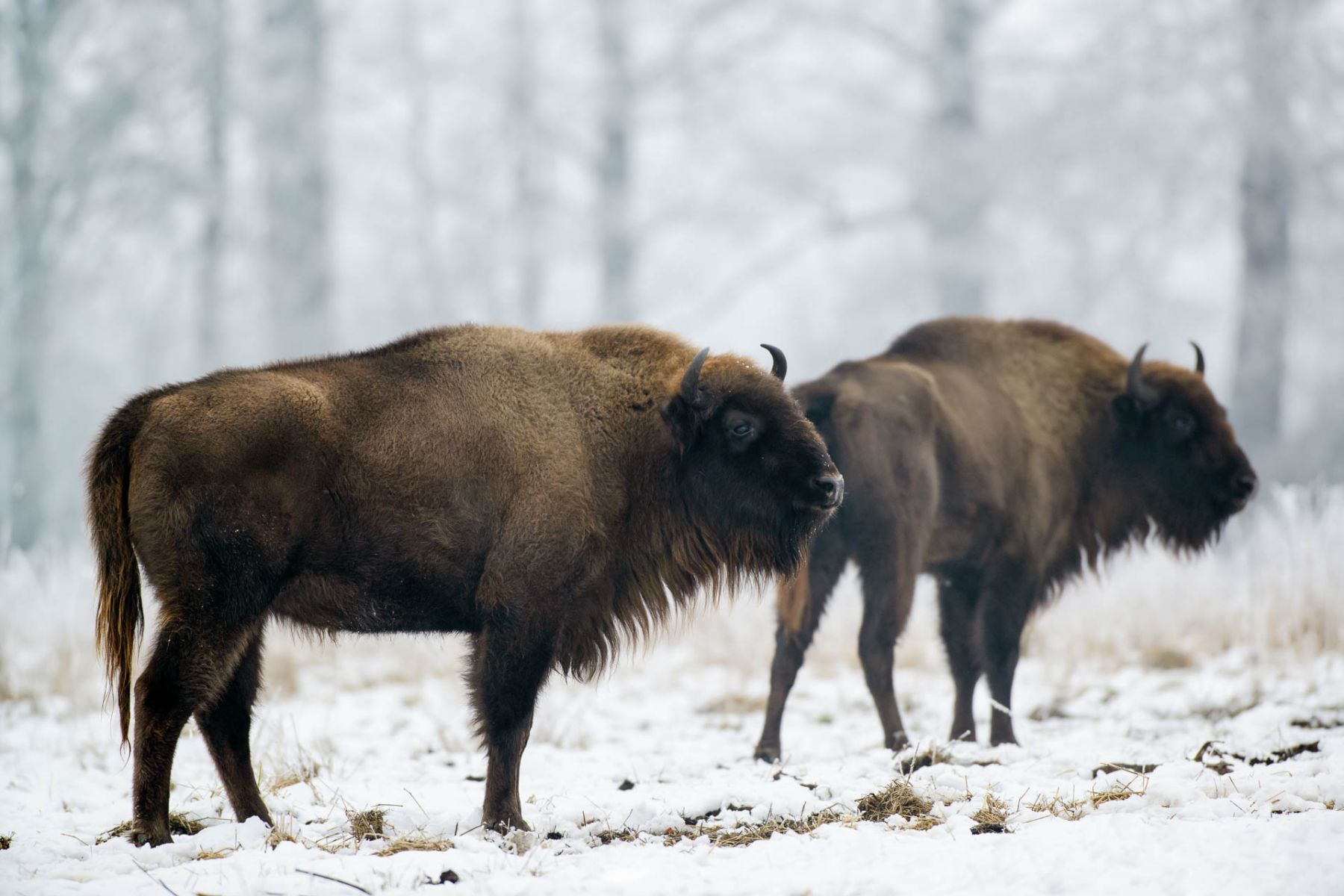 Zwei Wisente im Schnee stehend in einer winterlichen Landschaft
