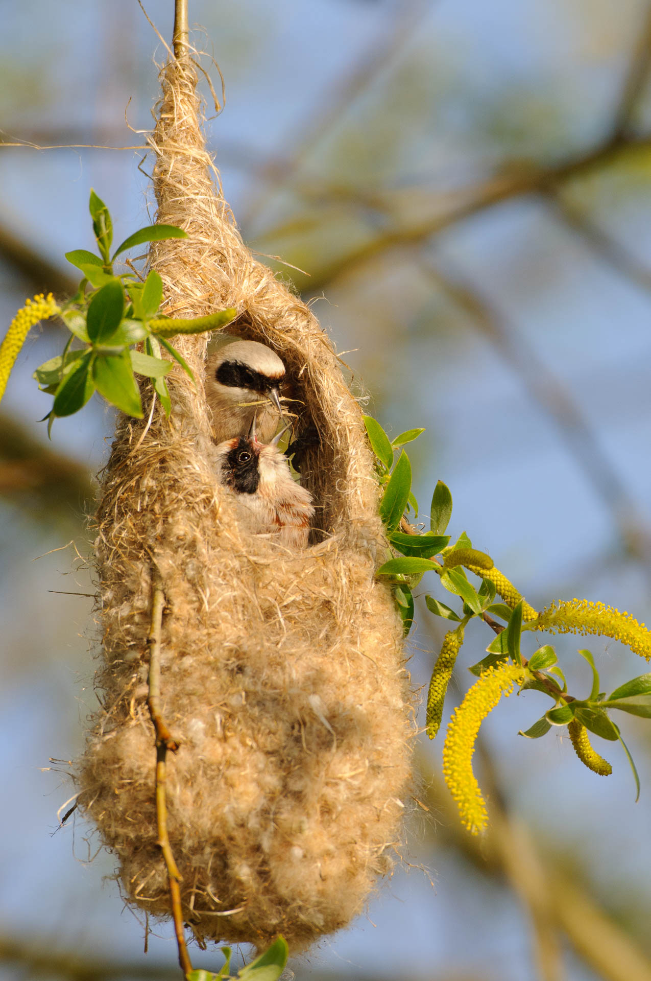 Beutelmeise füttert Jungvogel im kunstvoll geflochtenen Nest.