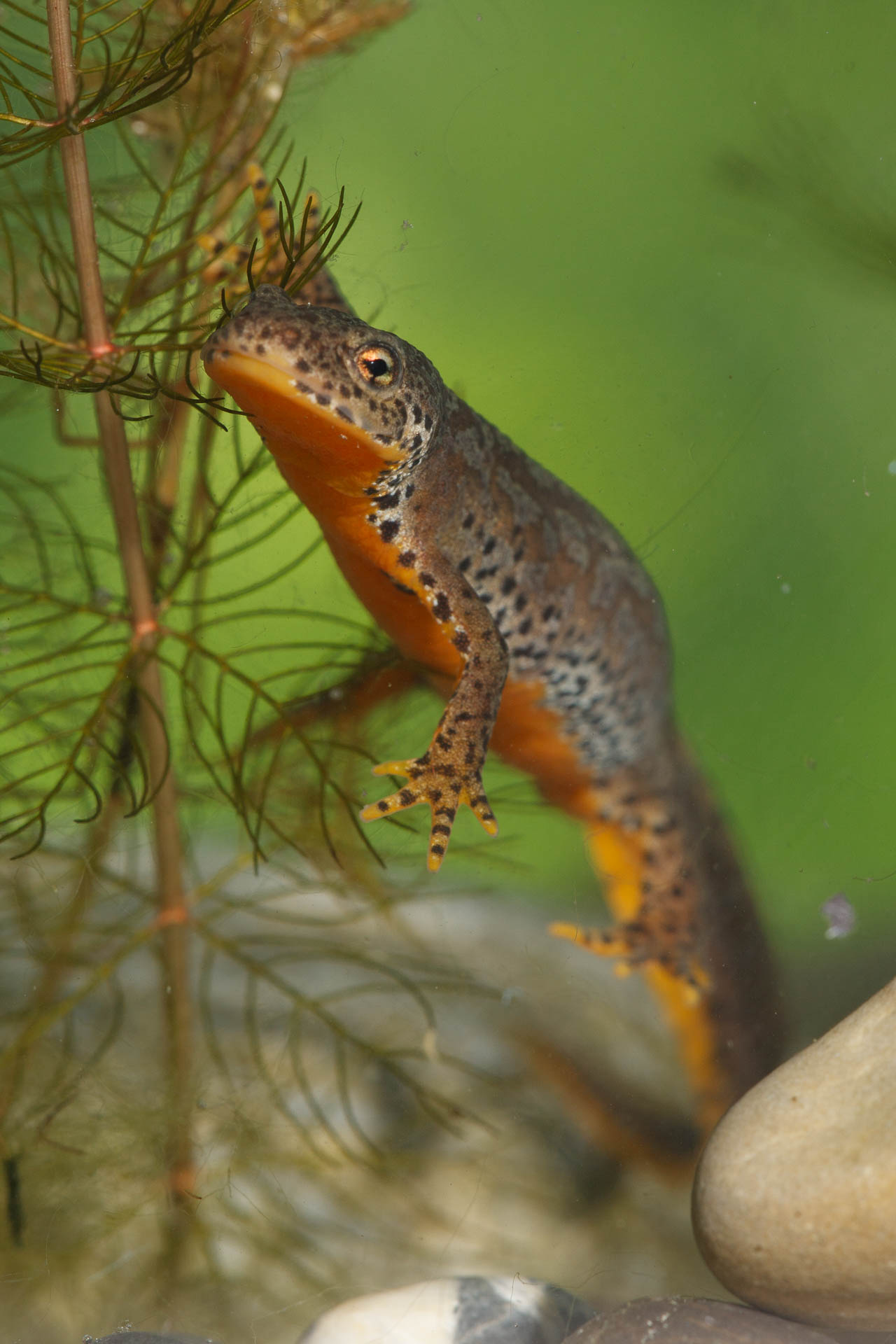 Ein Bergmolch mit oranger Unterseite schwimmt in einem mit Pflanzen durchsetzten Gewässer.