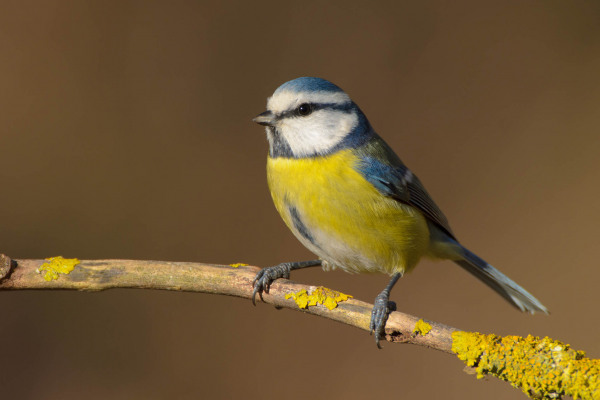 Blaumeise sitzt auf einem mit Flechten bewachsenen Ast.