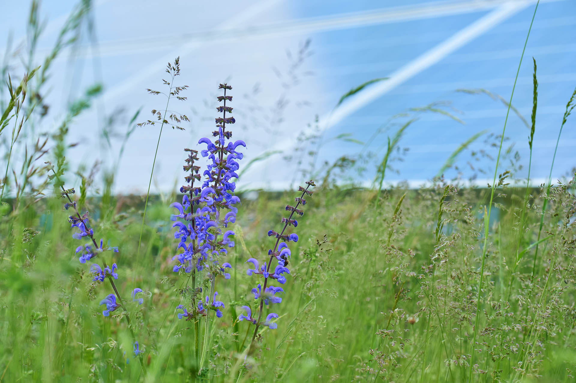 Wiesensalbei blüht in einem Grasfeld vor einer Solaranlage.