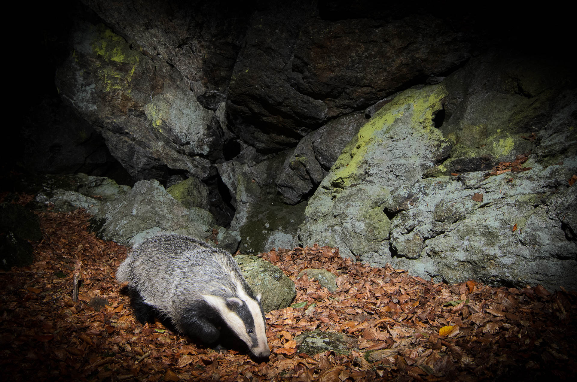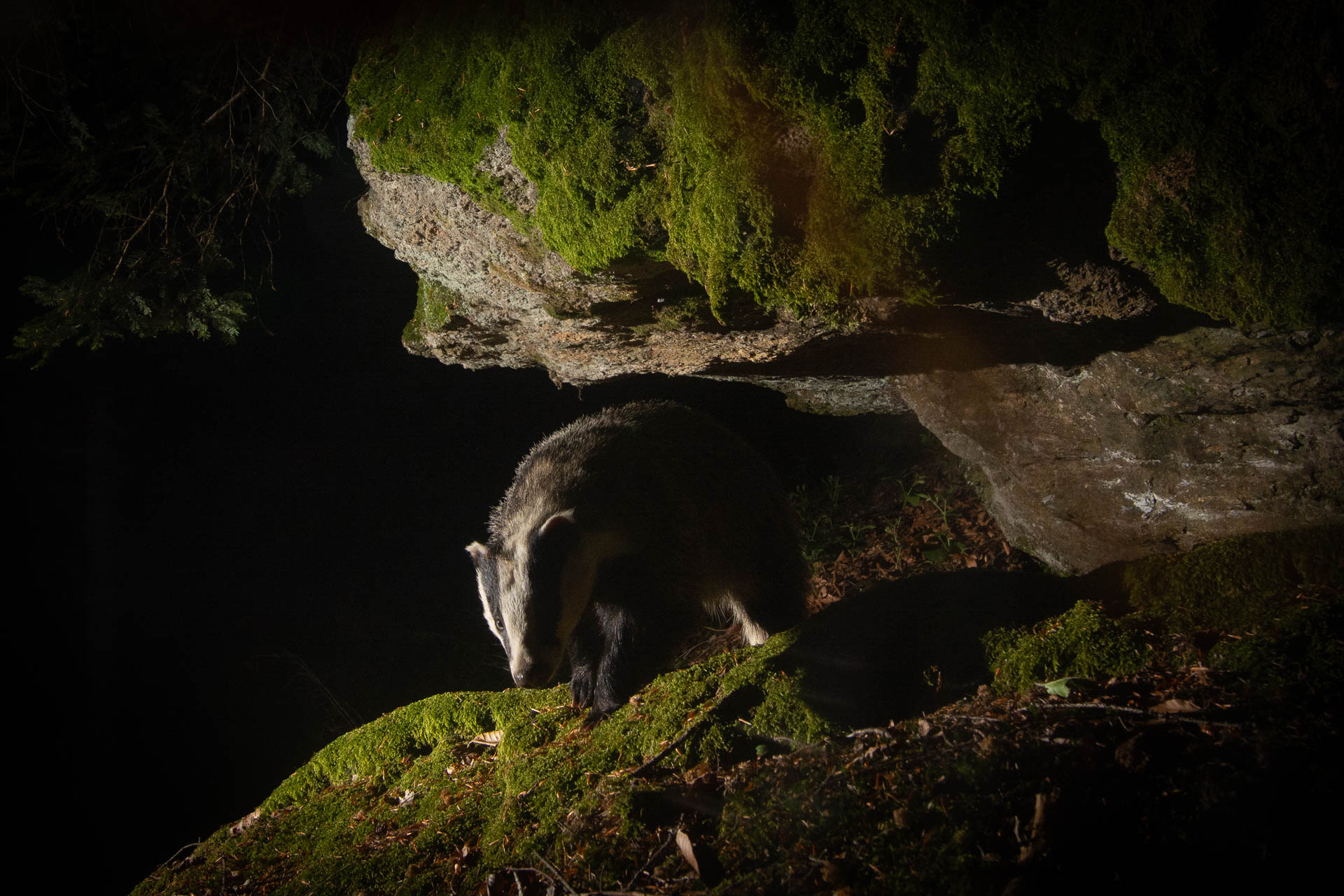 Europäischer Dachs unter einem moosbewachsenen Felsvorsprung bei Nacht.