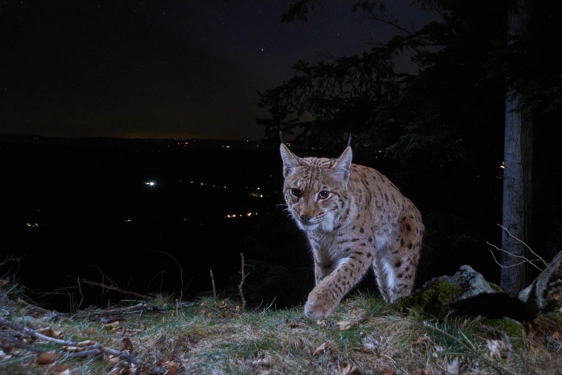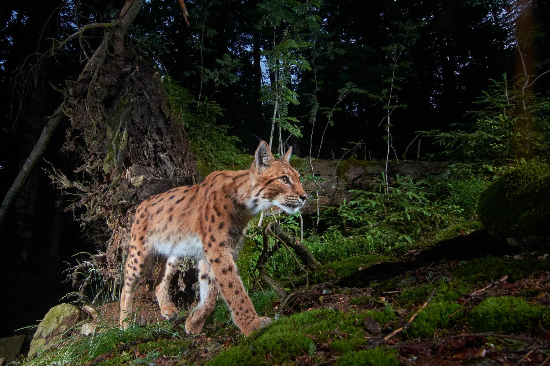 Ein Europäischer Luchs im nächtlichen Wald schreitet vorsichtig durch die Landschaft.
