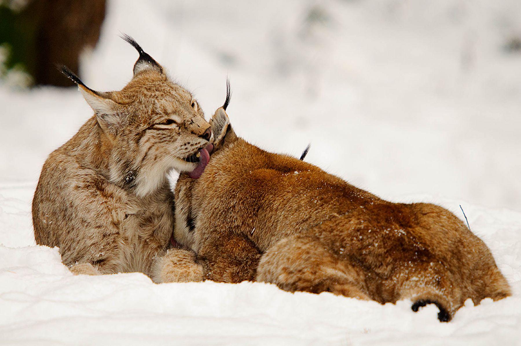 Ein junger Europäischer Luchs pflegt sein Fell im Wald.