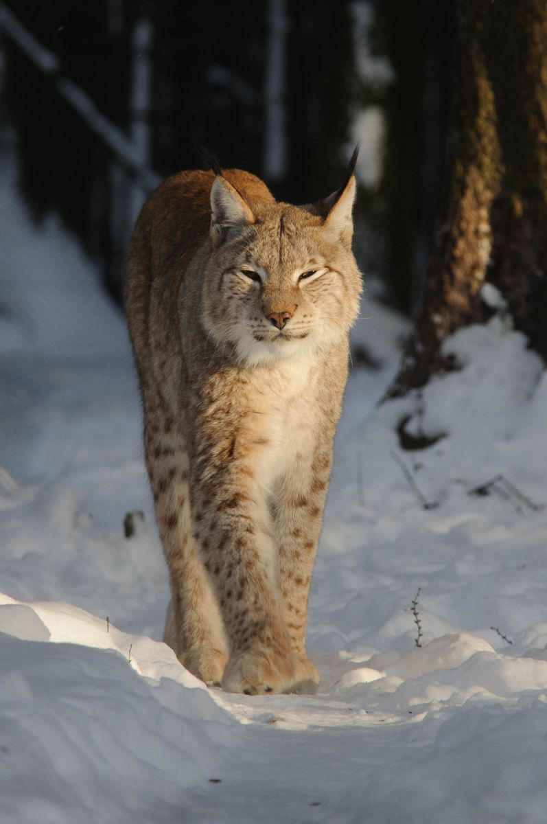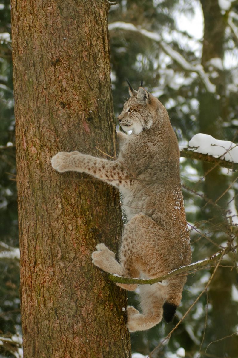 Ein Luchs klettert im verschneiten Wald auf einen Baumstamm.