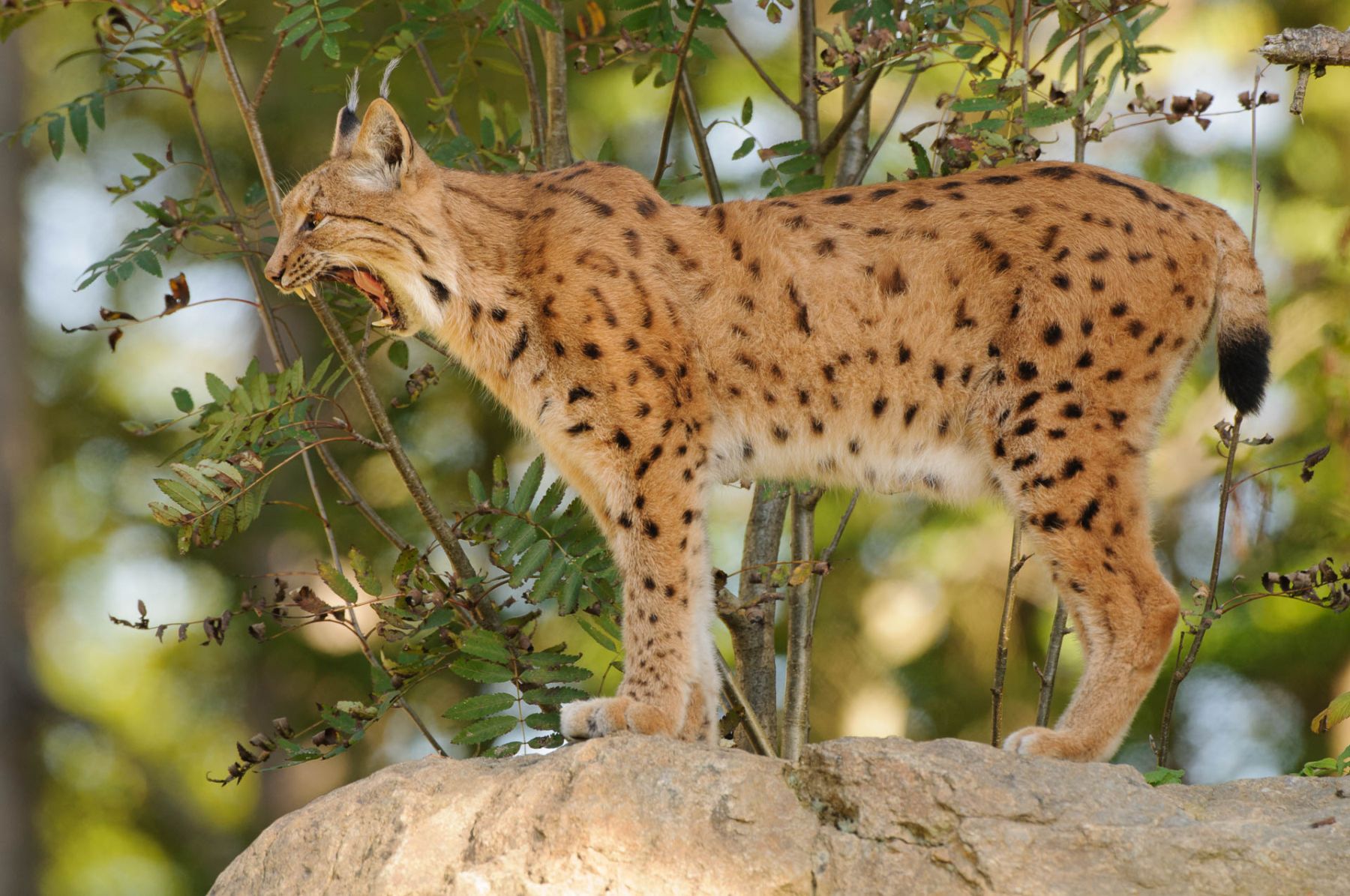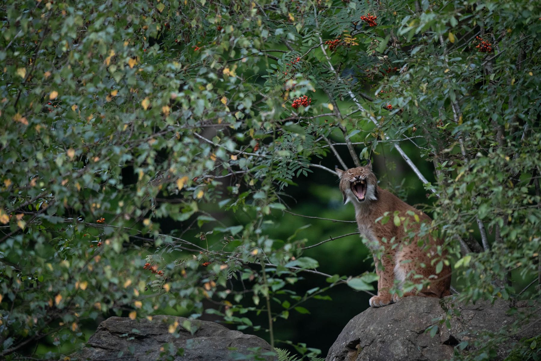 Eurasischer Luchs sitzt gähnend auf einem Felsen im Wald.