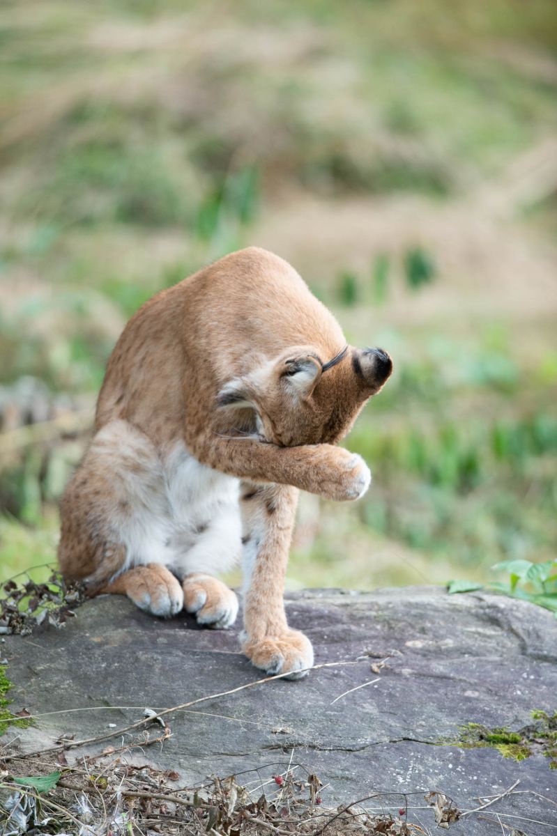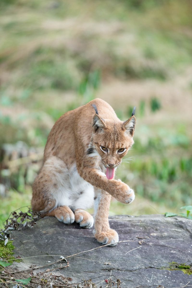 Ein Eurasischer Luchs leckt seine Pfote zur Fellpflege in grasbewachsenem Gebiet.