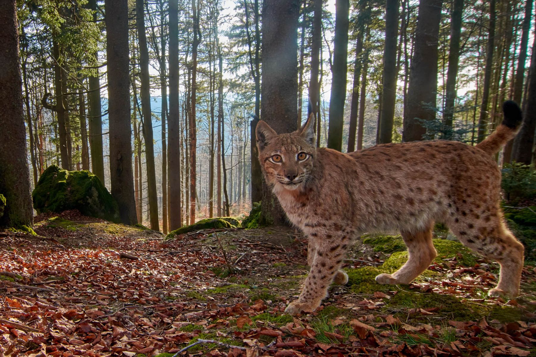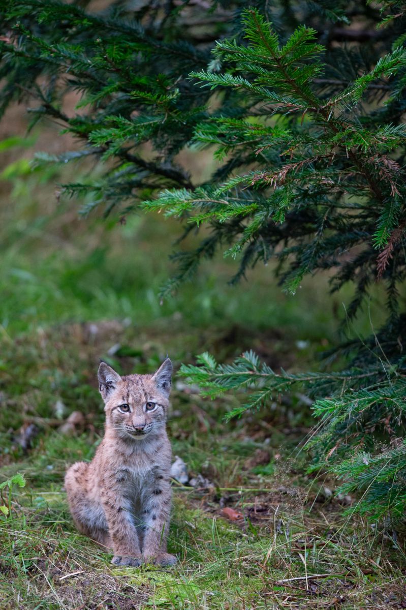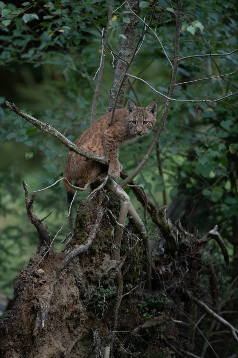 Ein junger Luchs steht neugierig in einem Waldgebiet unter Ästen.