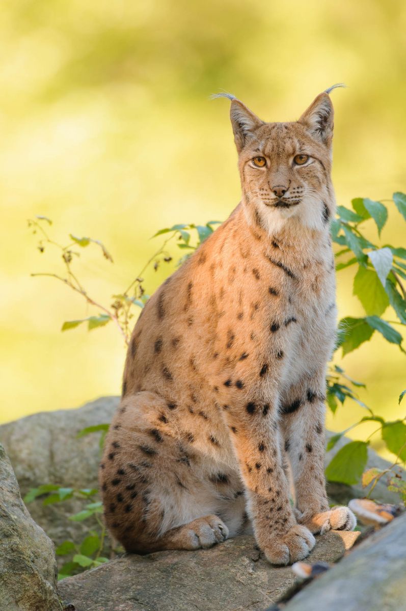 Eurasischer Luchs ruht auf Felsen, mit Pinselohr und geflecktem Fell.