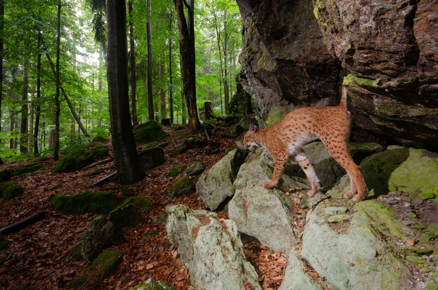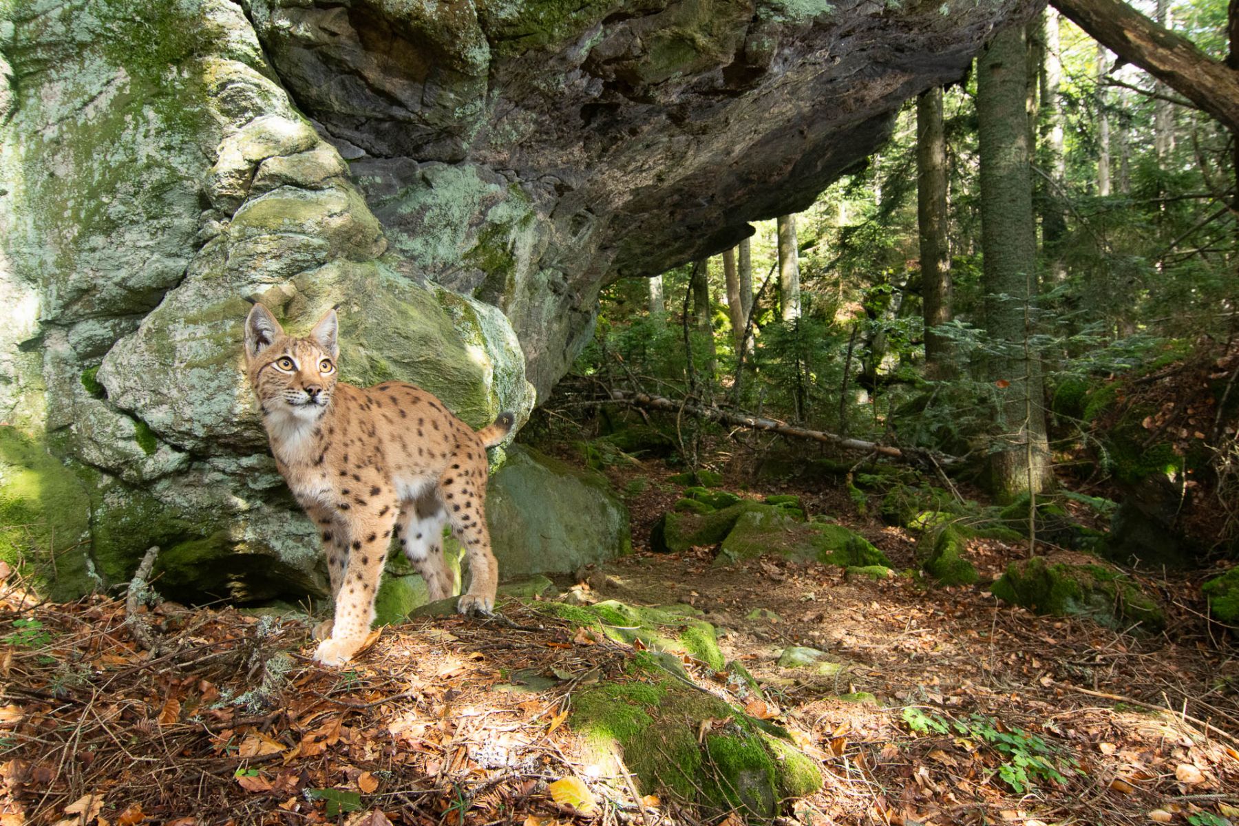 Ein Eurasischer Luchs bewegt sich durch felsiges Gelände in einem Wald.