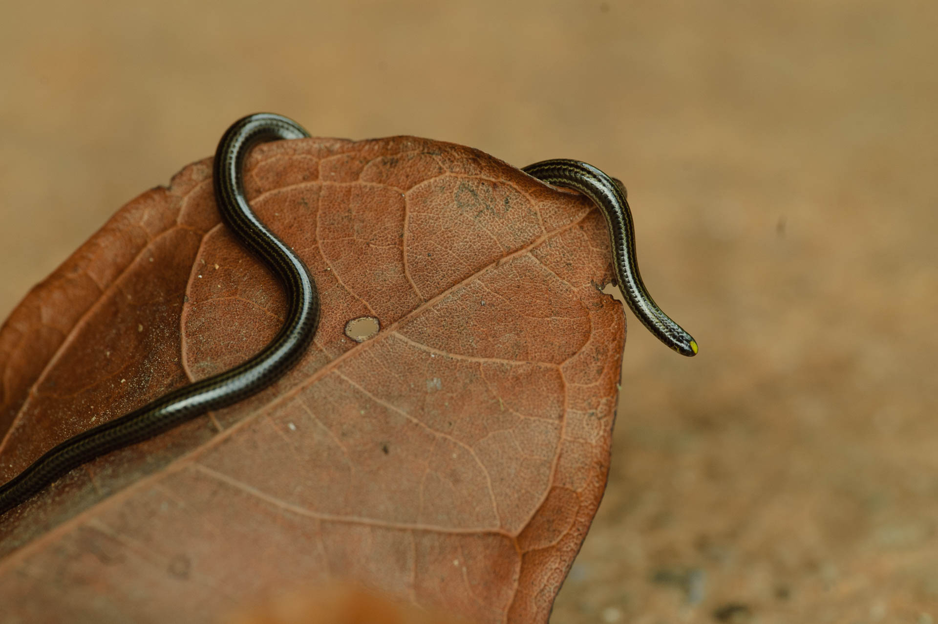 Kleine Wurmschlange liegt auf einem braunen Blatt, gut getarnt.