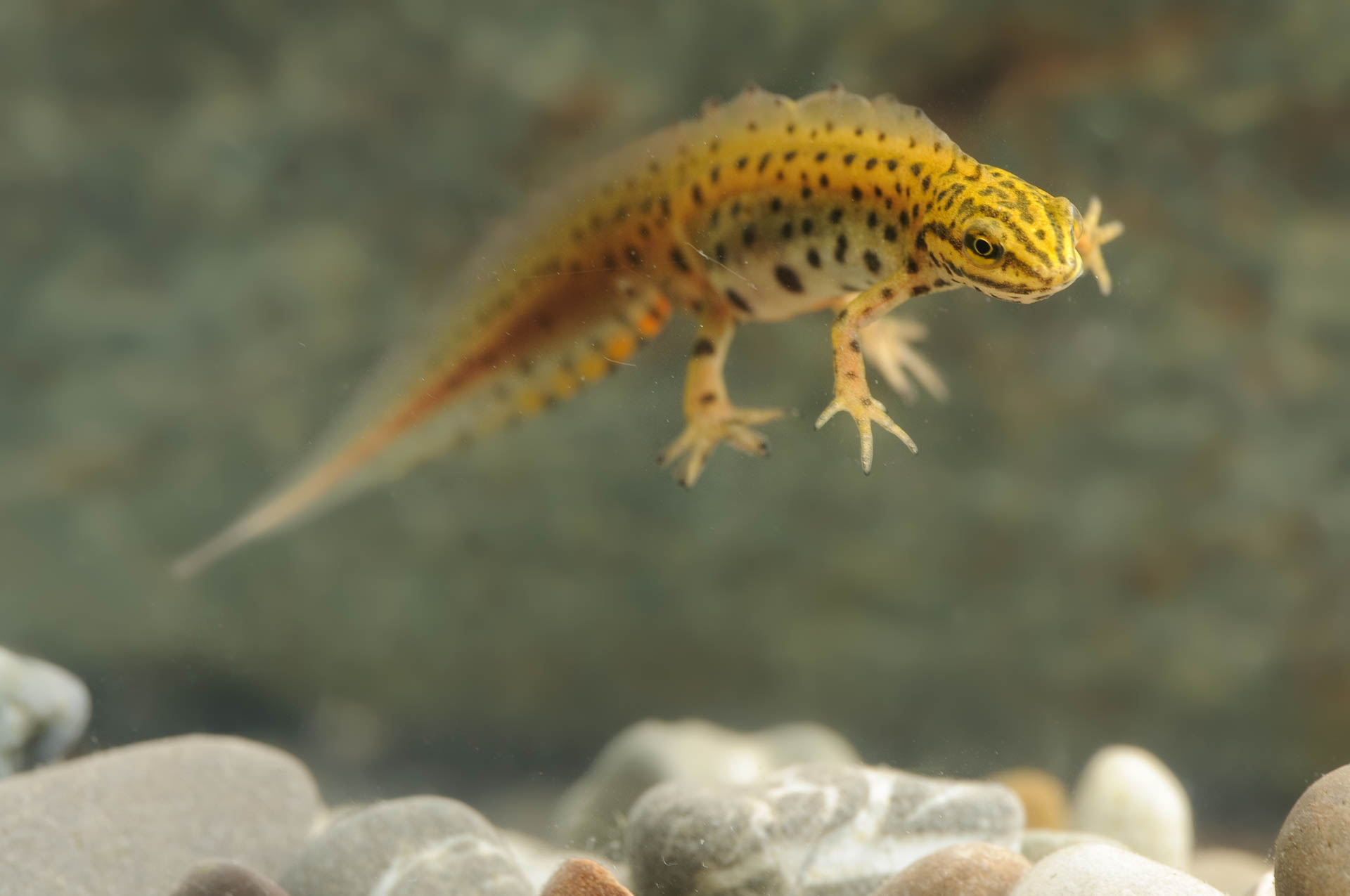Ein Teichmolch schwimmt über Kieselsteine im Wasser.