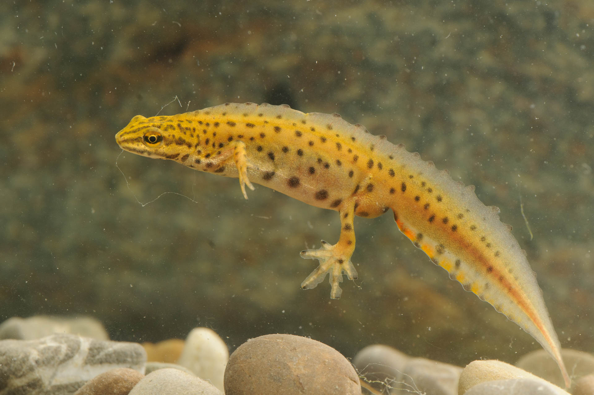 Ein Teichmolch schwimmt รผber Kieselsteine im Wasser.