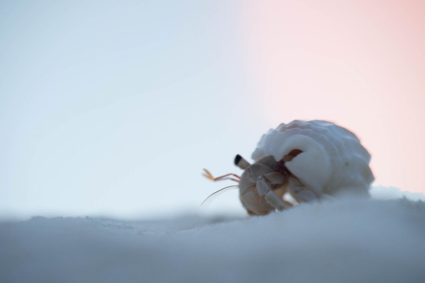 Ein Einsiedlerkrebs in einer Schneckenschale auf Sand.
