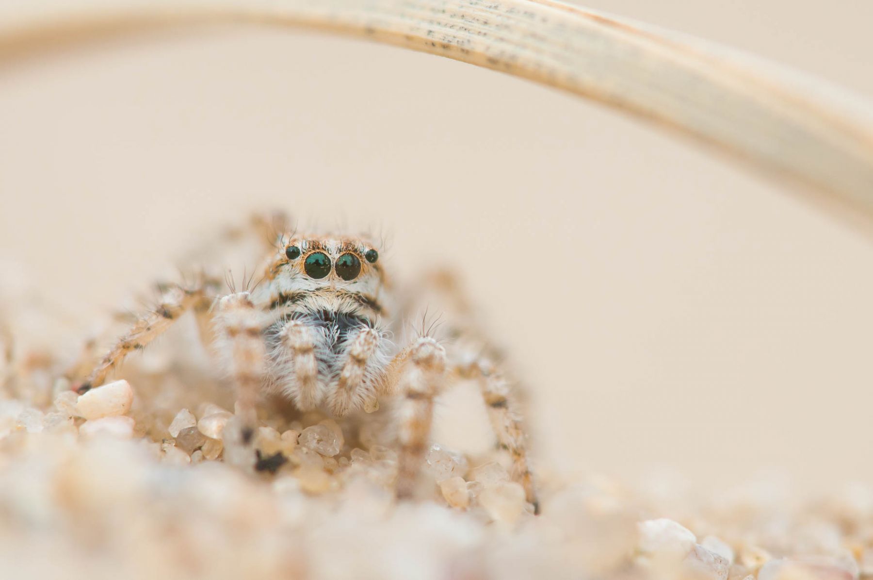 Dünen-Springspinne auf sandigem Untergrund, frontal aufgenommen.