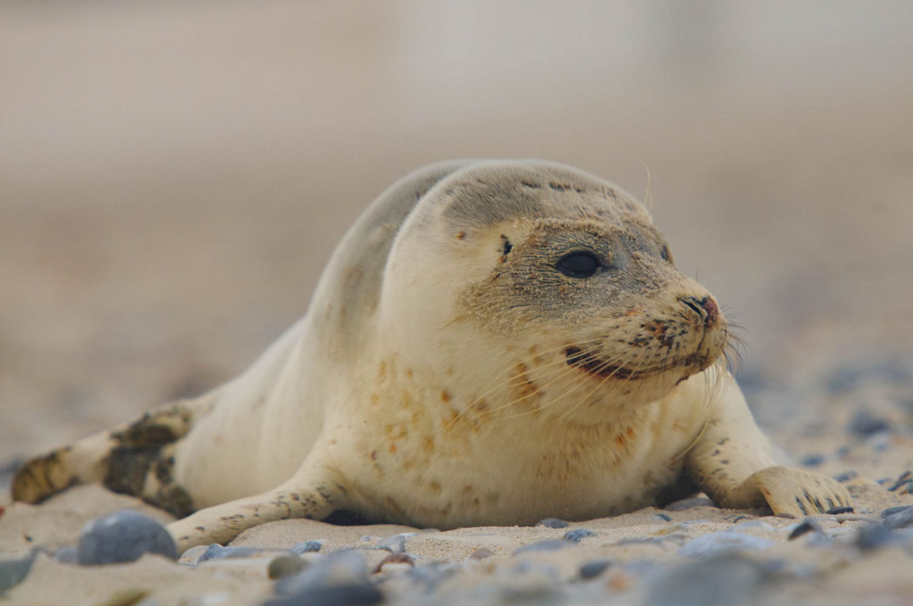Seehund liegt auf sandiger Küste, seitliches Profil