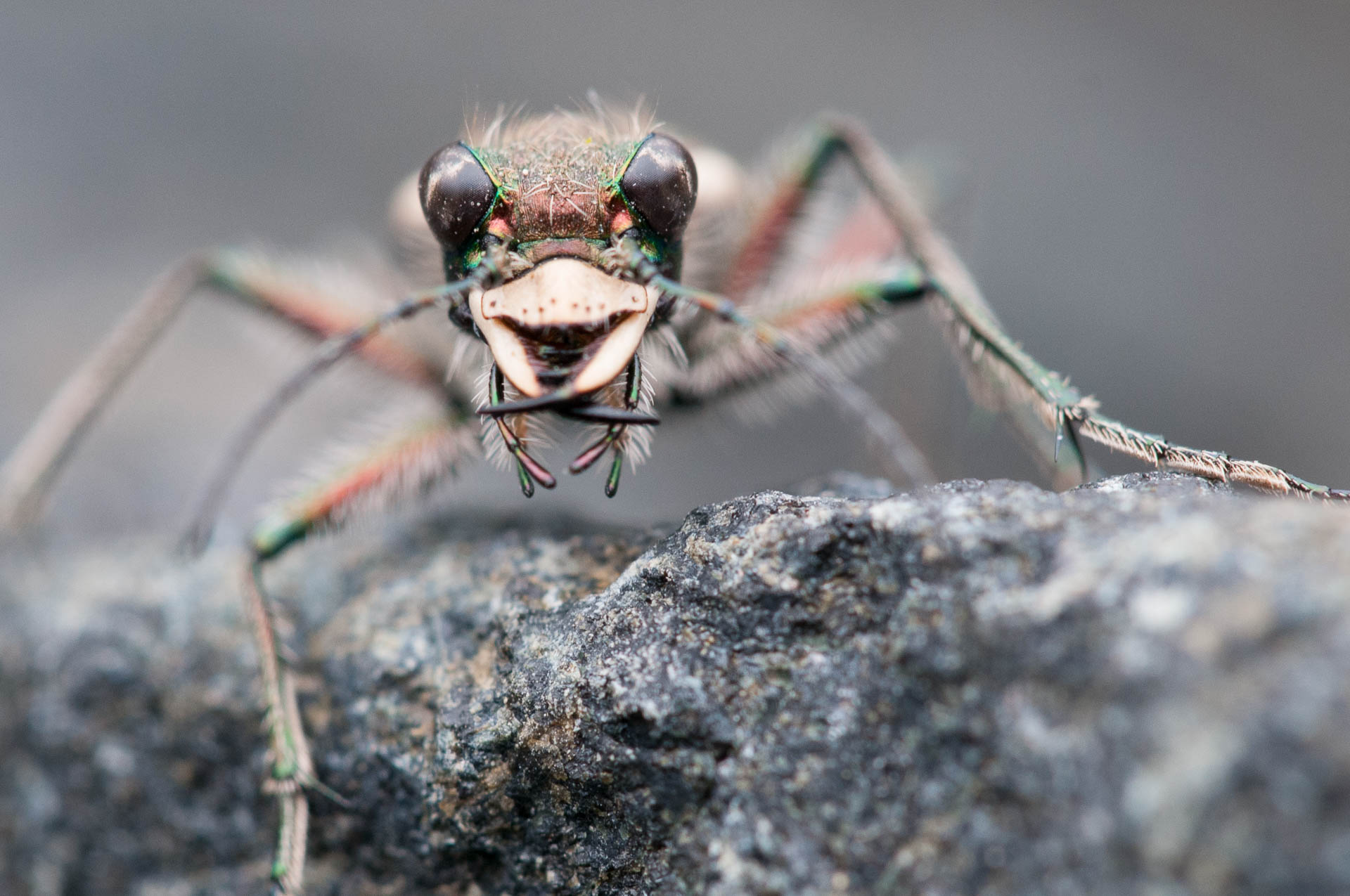 Ein Sandlaufkäfer (Cicindela sylvicola) auf einem Stein in Nahaufnahme.