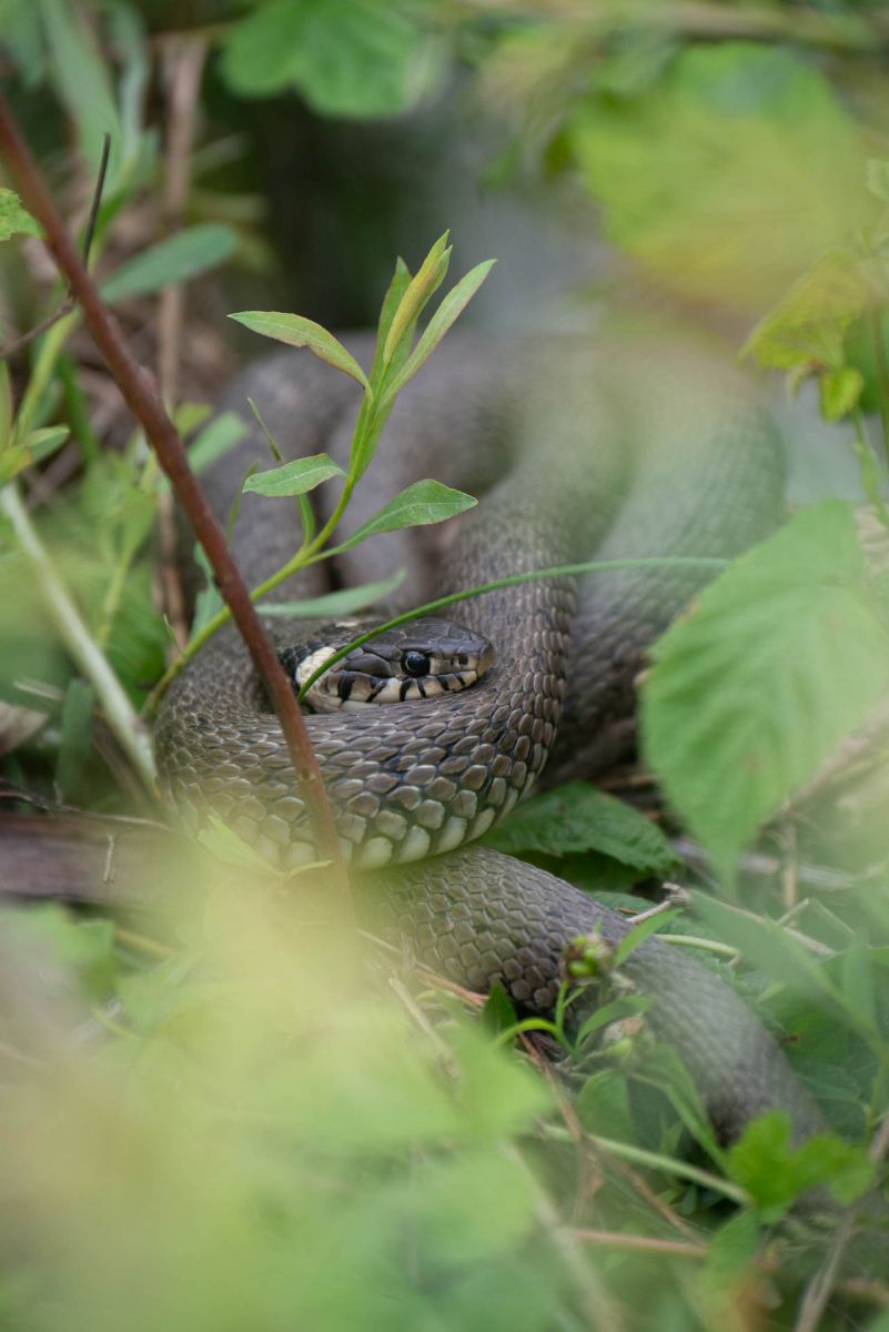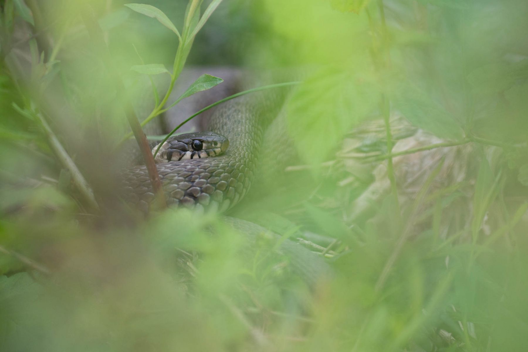 ร„skulapnatter windet sich durch einen blรผhenden Obstbaum.