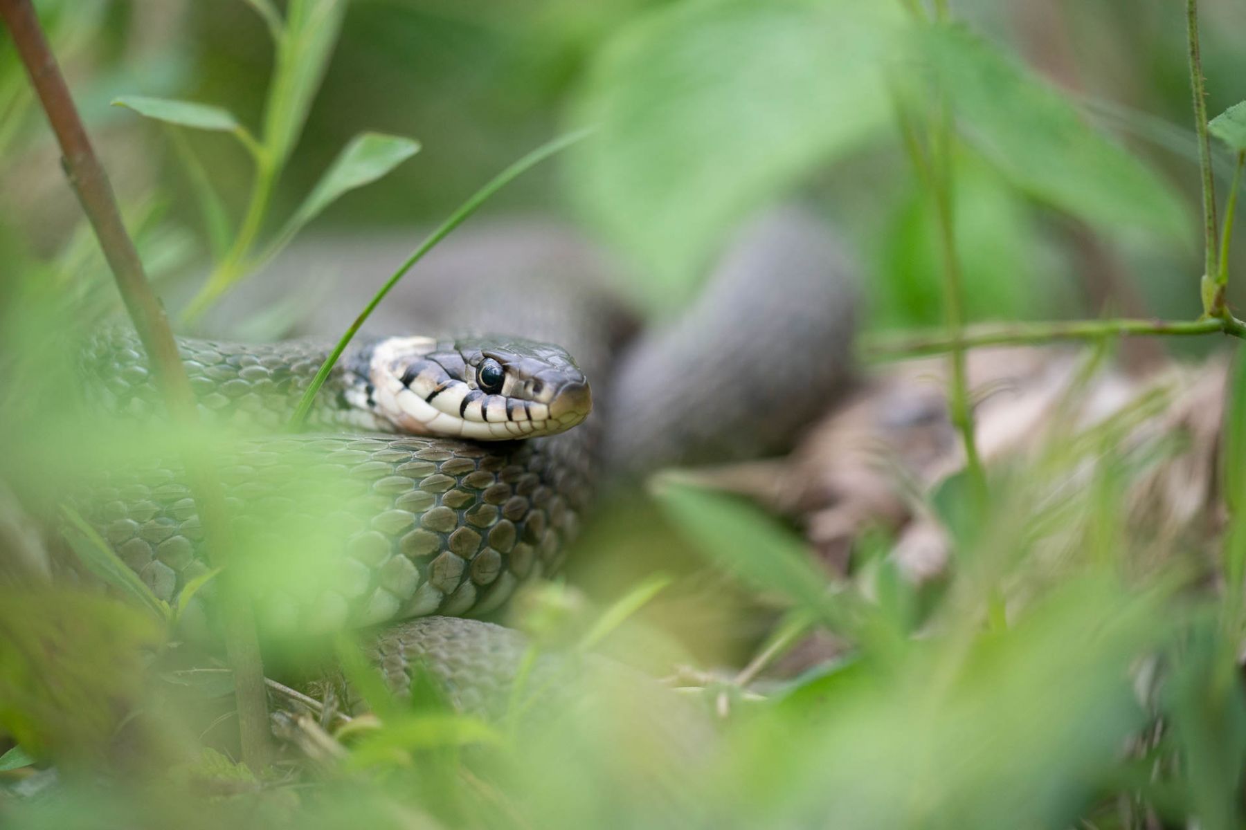 Schlingnatter (Coronella austriaca) inmitten von Pflanzen.
