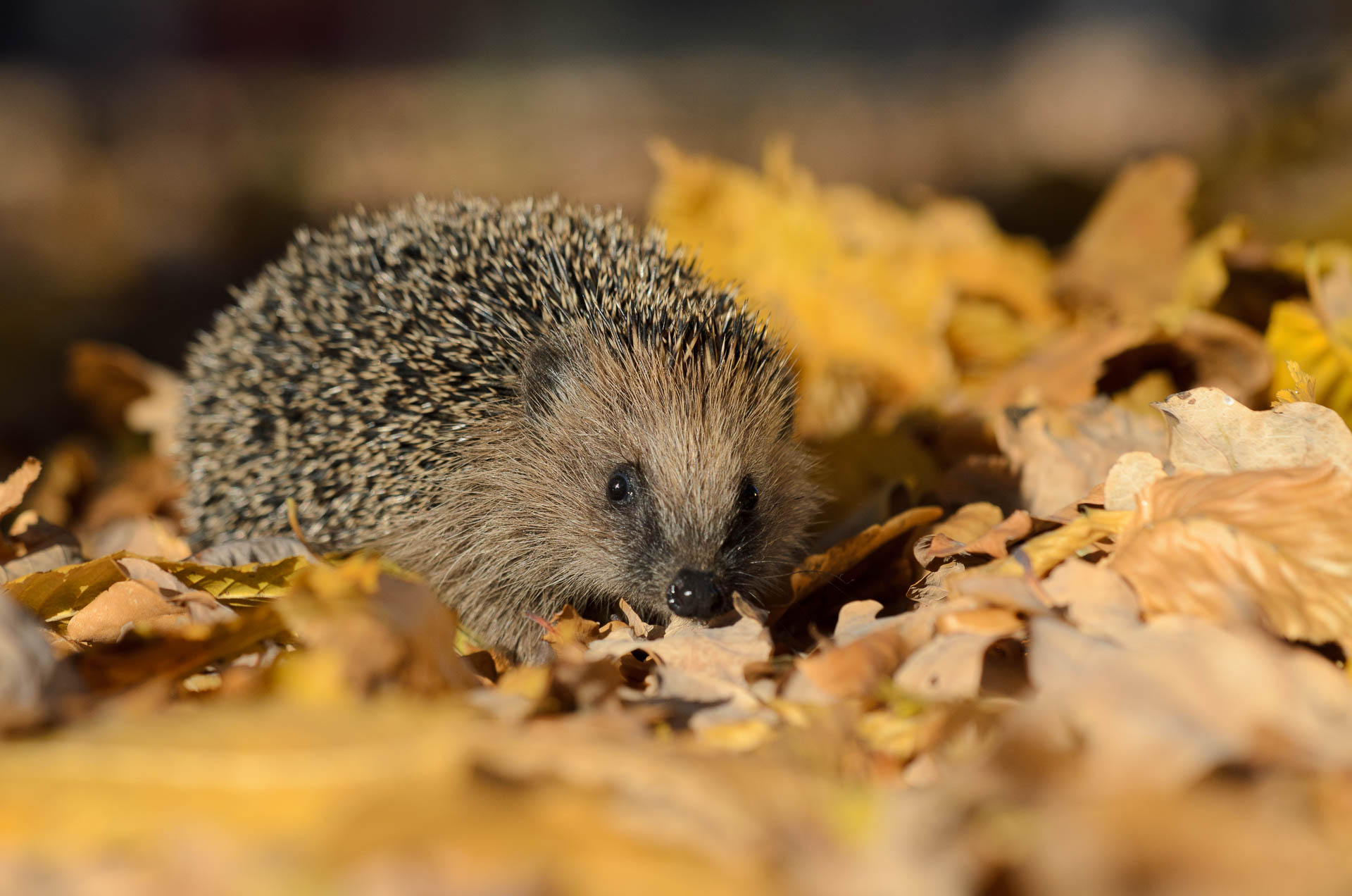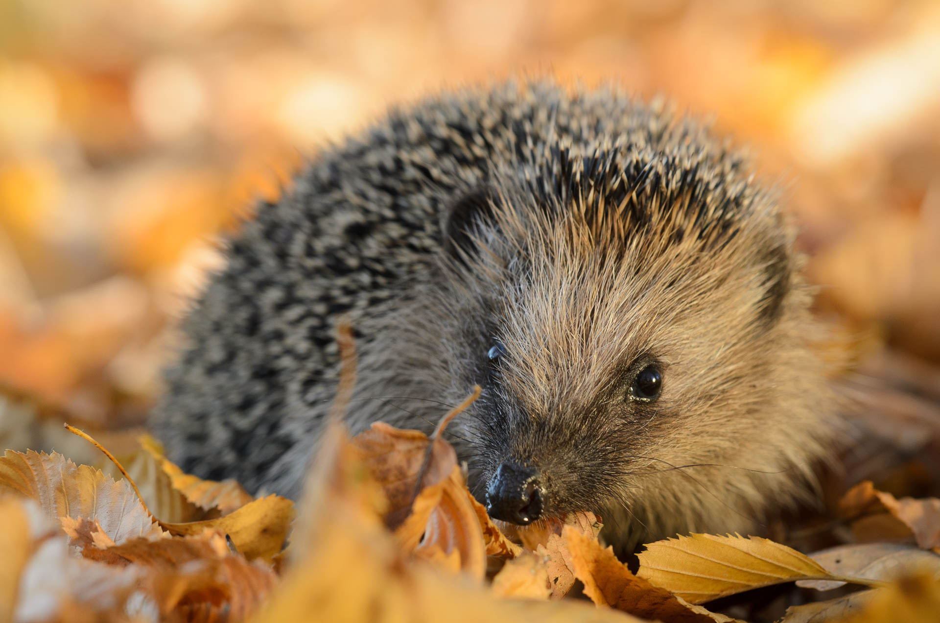 Ein Europäischer Igel sitzt im bunten Herbstlaub auf dem Boden.