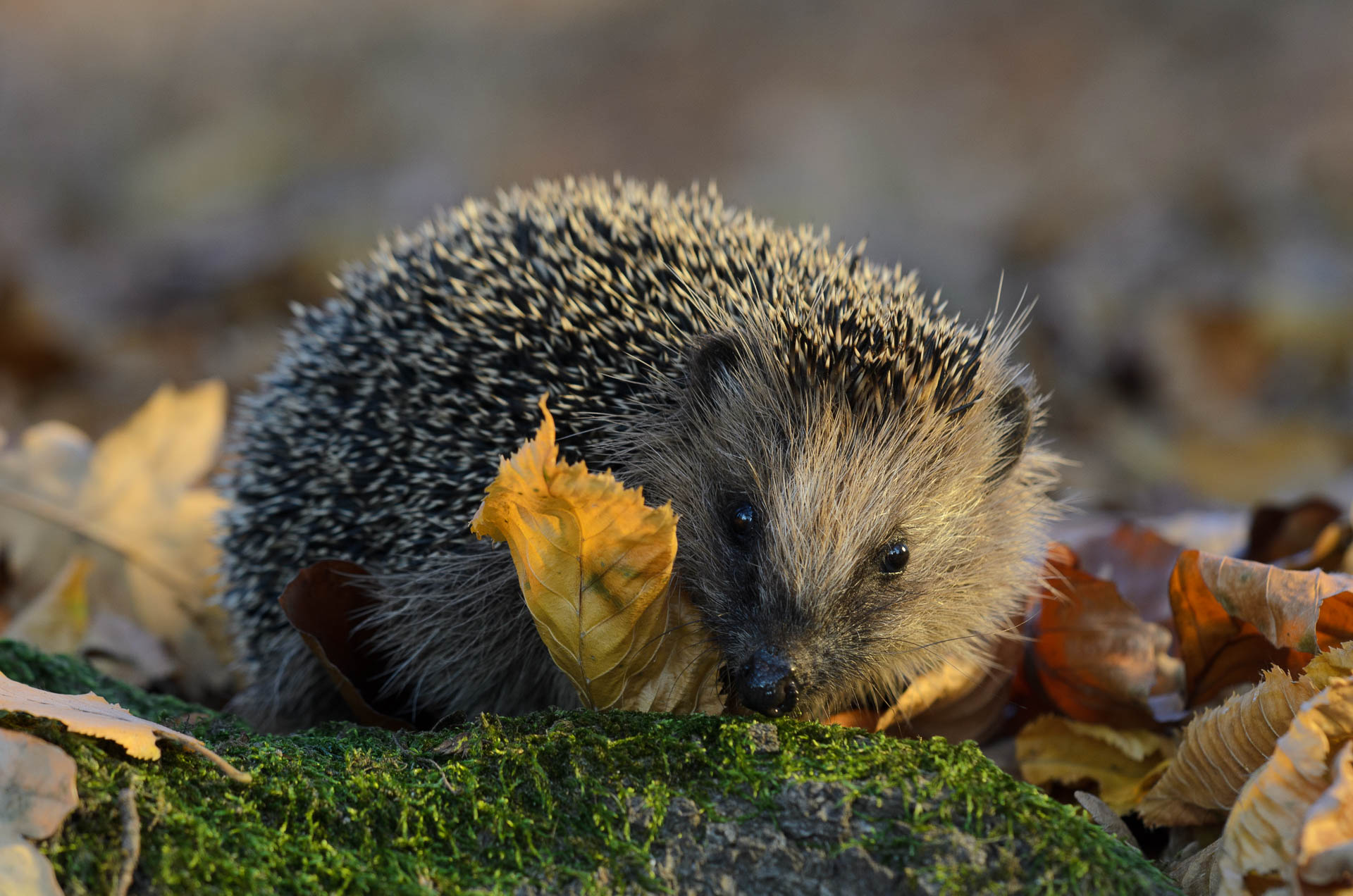 Ein Igel sitzt auf einem mit Moos bedeckten Baumstamm neben herbstlichen Blättern.