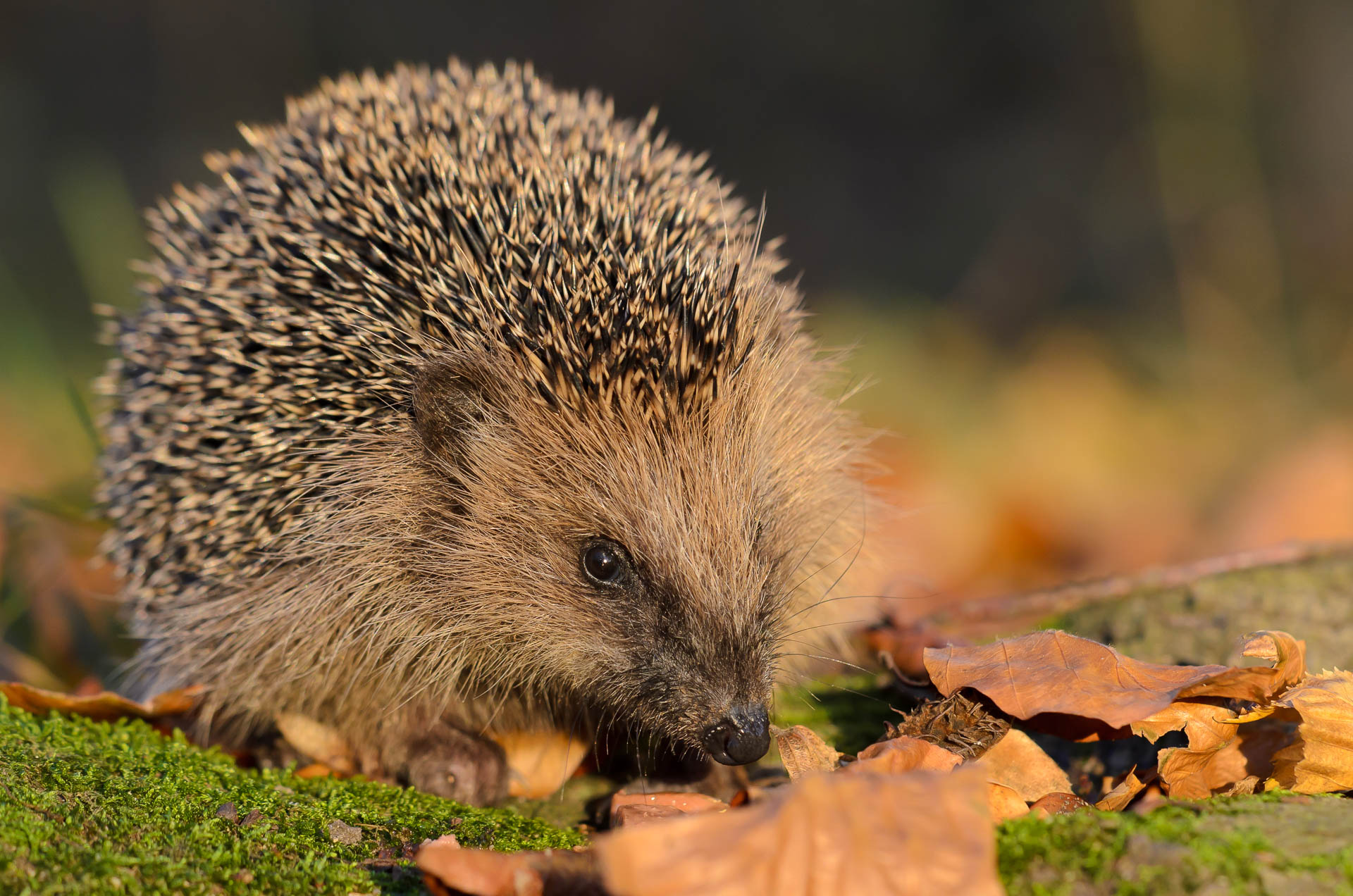 Ein Europäischer Braunbrustigel im Herbstlaub, seitlich betrachtet.