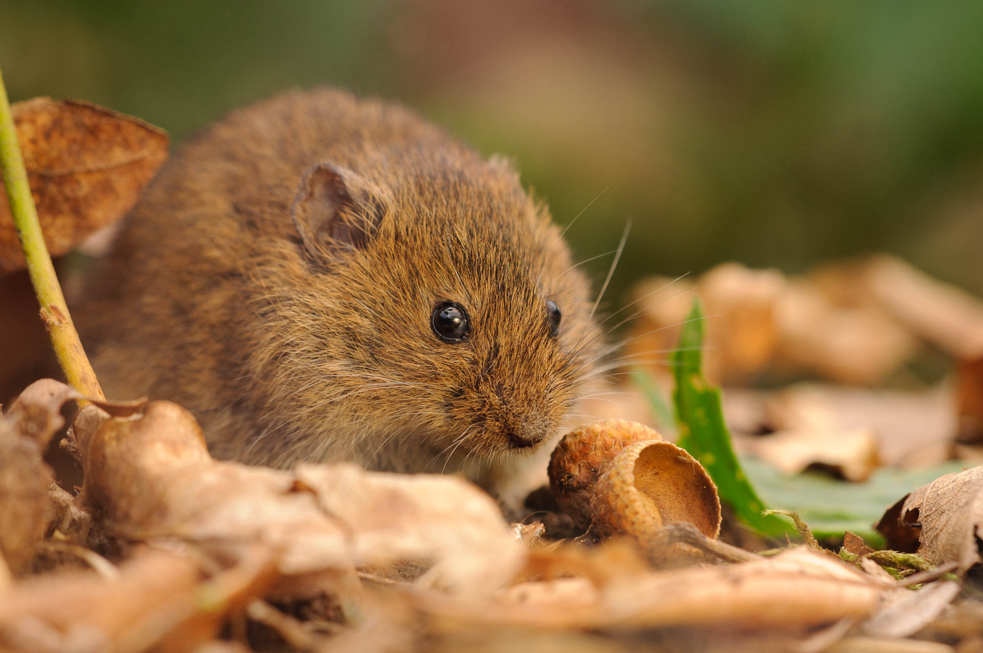 Eine Rötelmaus sitzt auf herbstlichen Blättern am Waldboden.