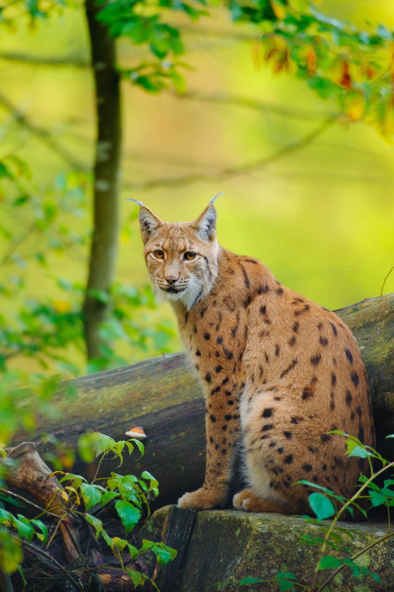 Eurasischer Luchs sitzt auf einem Baumstamm im Wald.