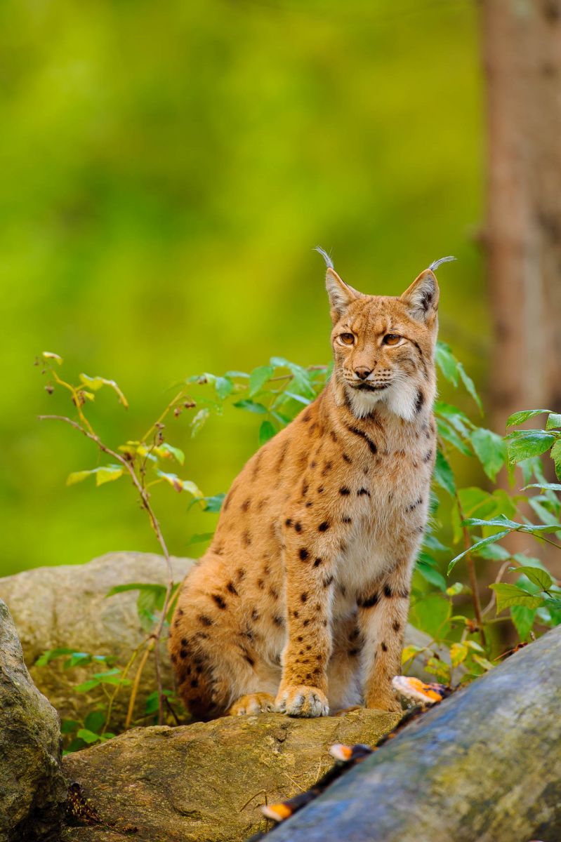Eurasischer Luchs mit markanten Pinselohren sitzt im grünen Wald.