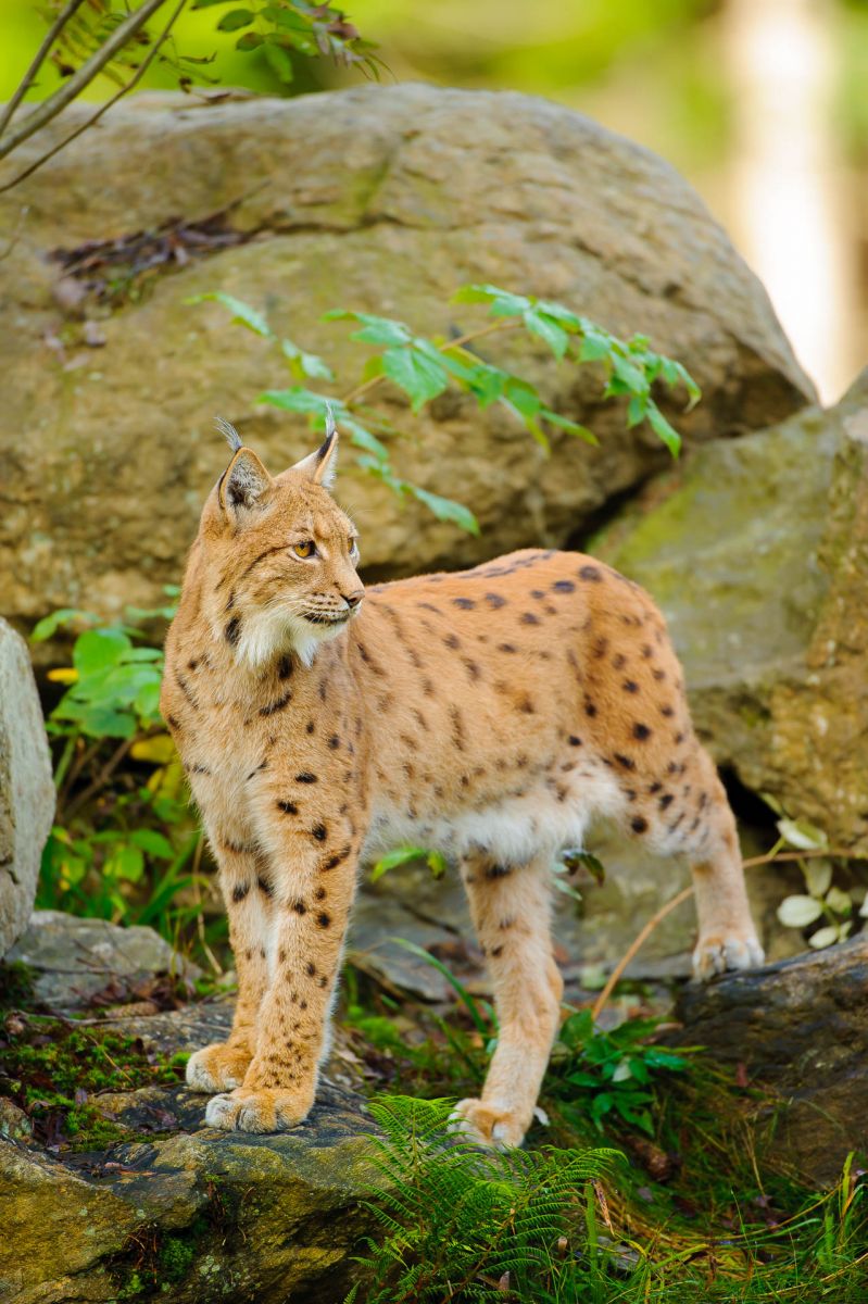 Eurasischer Luchs, der alert durch einen Wald schaut, umgeben von Felsen.
