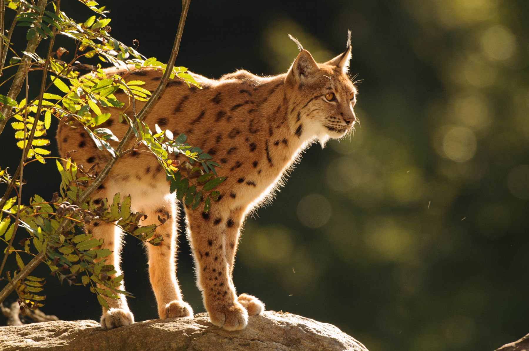 Eurasischer Luchs steht auf einem Felsen in der Abendsonne.